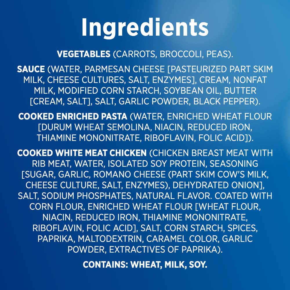 Ingredients: INGREDIENTS: VEGETABLES (CARROTS, BROCCOLI, PEAS), SAUCE, WATER, CREAM, GRATED PARMESAN CHEESE (PASTEURIZED PART SKIM MILK, CHEESE CULTURES, SALT, ENZYMES), NONFAT MILK, SALT, MODIFIED FOOD STARCH, SOYBEAN OIL, GARLIC POWDER, SPICES, COOKED ENRICHED PASTA, WATER, ENRICHED DURUM WHEAT SEMOLINA (SEMOLINA, NIACIN, FERROUS SULFATE, THIAMINE MONONITRATE, RIBOFLAVIN, FOLIC ACID), COOKED WHITE CHICKEN MEAT COATED WITH SEASONING, CHICKEN MEAT, WATER, ISOLATED SOY PROTEIN, SEASONING [SUGAR, GARLIC, ROMANO CHEESE (PART SKIM COW'S MILK, CHEESE CULTURES, SALT, ENZYMES), DEHYDRATED ONION], SALT, SODIUM PHOSPHATES, NATURAL FLAVOR. COATING [CORN FLOUR, ENRICHED WHEAT FLOUR (WHEAT FLOUR, NIACIN, REDUCED IRON, THIAMINE MONONITRATE, RIBOFLAVIN, FOLIC ACID), SALT, CORN STARCH, SPICES, PAPRIKA, MALTODEXTRIN, CARAMEL COLOR, GARLIC POWDER, EXTRACTIVES OF PAPRIKA], . Contains: Milk, Soy, Wheat