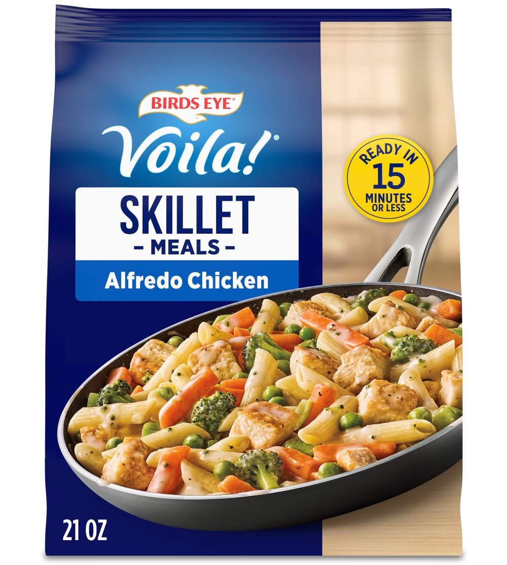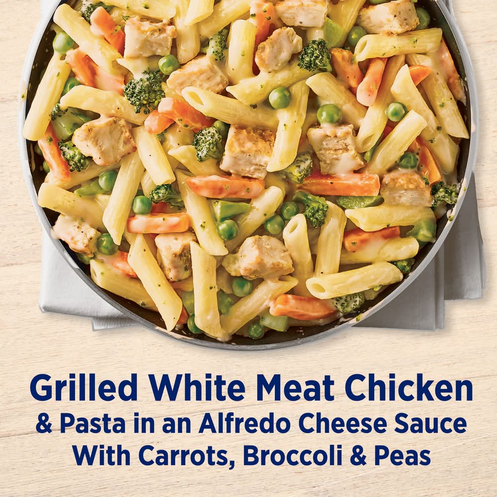 Serve up a delicious meal in minutes with Birds Eye Voila! Alfredo Chicken. With premium Birds Eye vegetables, quality meat and chef-inspired sauces in every bag, Birds Eye Voila! offers complete frozen meals for quick weeknight dinners the whole family will love. This delicious chicken pasta frozen dinner combines white meat chicken, pasta, broccoli, carrots, and peas in a creamy Alfredo sauce for a flavorful meal you can make any night of the week. This Birds Eye pasta dinner with mixed vegetables is made with no artificial flavors and no preservatives for a quick and convenient family dinner solution without compromise. Easily prepare frozen family meals in about 12 minutes on the stove-top or in the microwave. For stove-top preparation, pour sauce pouch and contents of the bag into a skillet with water, stir and simmer until heated through according to package instructions. For even faster preparation, microwave the chicken Alfredo pasta frozen meal according to the package instructions. Store this 21 ounce bag in the freezer to maintain freshness until you are ready to prepare frozen family dinners. It’s good to eat vegetables, so Birds Eye makes vegetables good to eat. Conagra Brands, Inc., Chicago, IL 60654