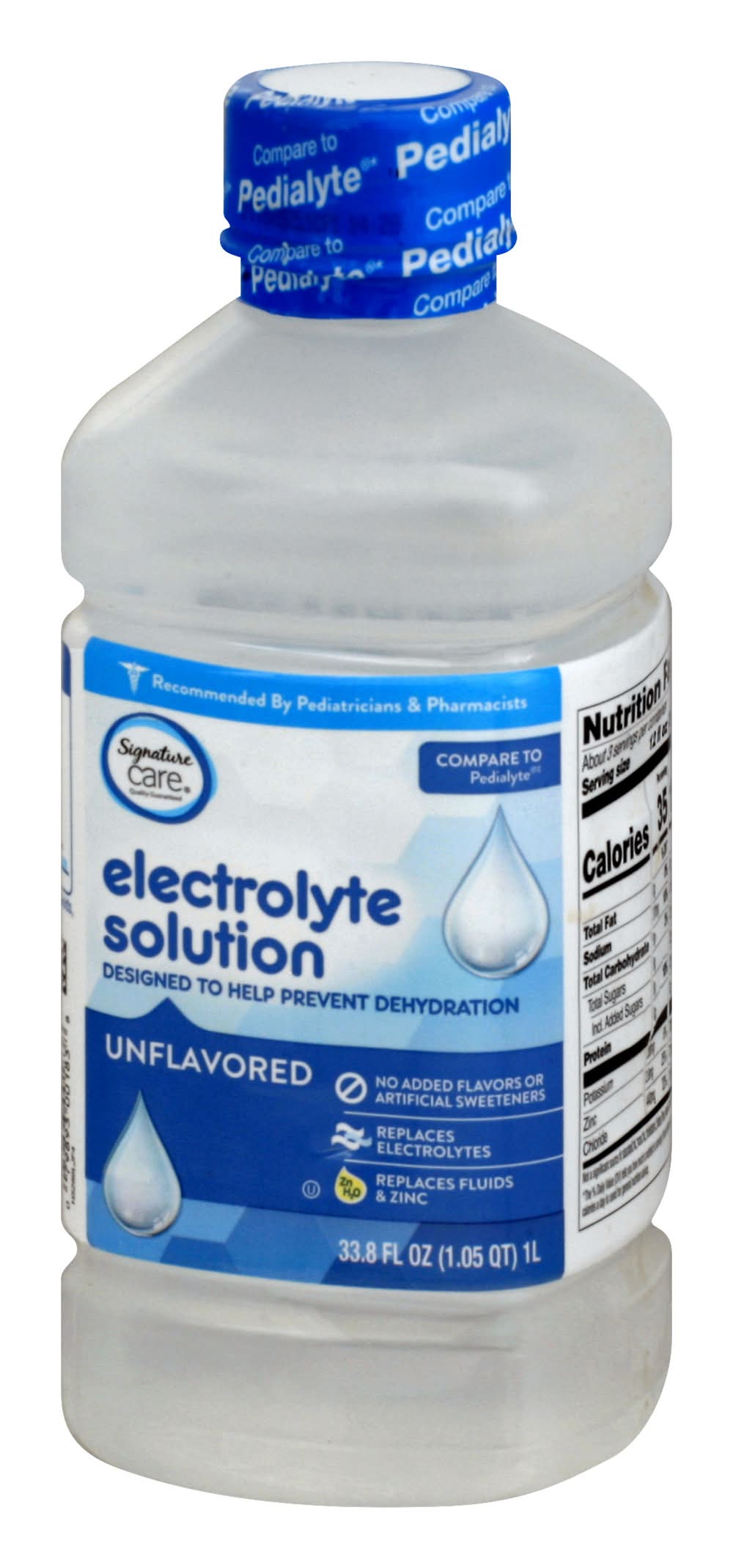 One Liter of Signature Care Electrolyte Solution Provides: sodium, 45 mEq; potassium, 20 mEq; chloride, 35 mEq. Recommended by pediatricians & pharmacists. Compare to Pedialyte (Pedialyte is a registered trademark of Abbott Laboratories. This product is not manufactured or distributed by Abbott Nutrition, Abbott Laboratories, the distributor Pedialyte). Designed to help prevent dehydration. No added flavors or artificial sweeteners. Replaces electrolytes. Replaces fluids & zinc. Designed to help prevent dehydration (For mild moderate dehydration) more effectively than common beverages. Signature Care Electrolyte Solution quickly replenishes fluids, zinc, and electrolytes to help prevent dehydration due to: vomiting & diarrhea, intense exercise, heat exhaustion, travel. Designed for fast, effective rehydration. Quality guaranteed. Our Promise: Quality & satisfaction 100% guaranteed or your money back. www.betterlivingbrands.com. Scan for more information. Questions or comments? 1-800-485-9969. • Better Living Brands LLC, PO Box 99, Pleasanton, CA, 94566-0009 • Packaging: Reusable