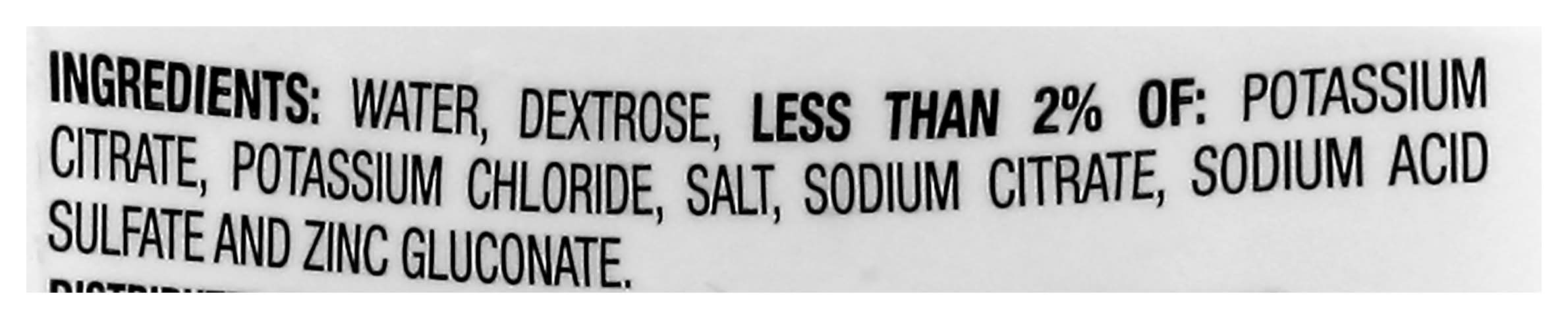 Ingredients: Water, Dextrose, Less than 2% Citrate, Potassium Chloride, Salt Sodium Citrate, Sodium Acid Sulfate and Zinc Gluconate.