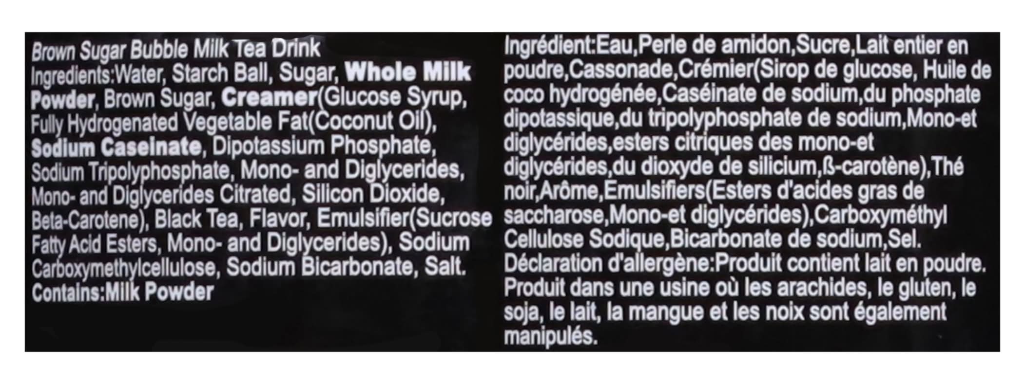 Ingredients: Water, Starch Ball, Sugar, Whole Milk Powder, Brown Sugar, Creamer (Glucose Syrup, Fully Hydrogenated Vegetable Fat (Coconut Oil), Sodium Caseinate, Dipotassium Phosphate, Sodium Tripolyphosphate, Mono- and Diglycerides, Mono- and Diglycerides Citrated, Silicon Dioxide, Beta-Carotene), Black Tea, Flavor, Emulsifier (Sucrose Fatty Acid Esters, Mono- and Diglycerides), Sodium Carboxymethylcellulose, Sodium Bicarbonate, Salt Contains: Milk, Tree Nuts, Coconuts, Gluten, Soybeans, Tree Nuts, Peanuts, Milk
