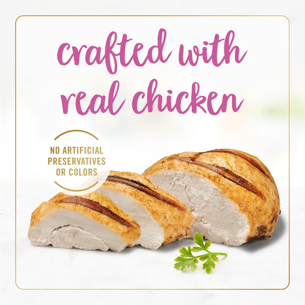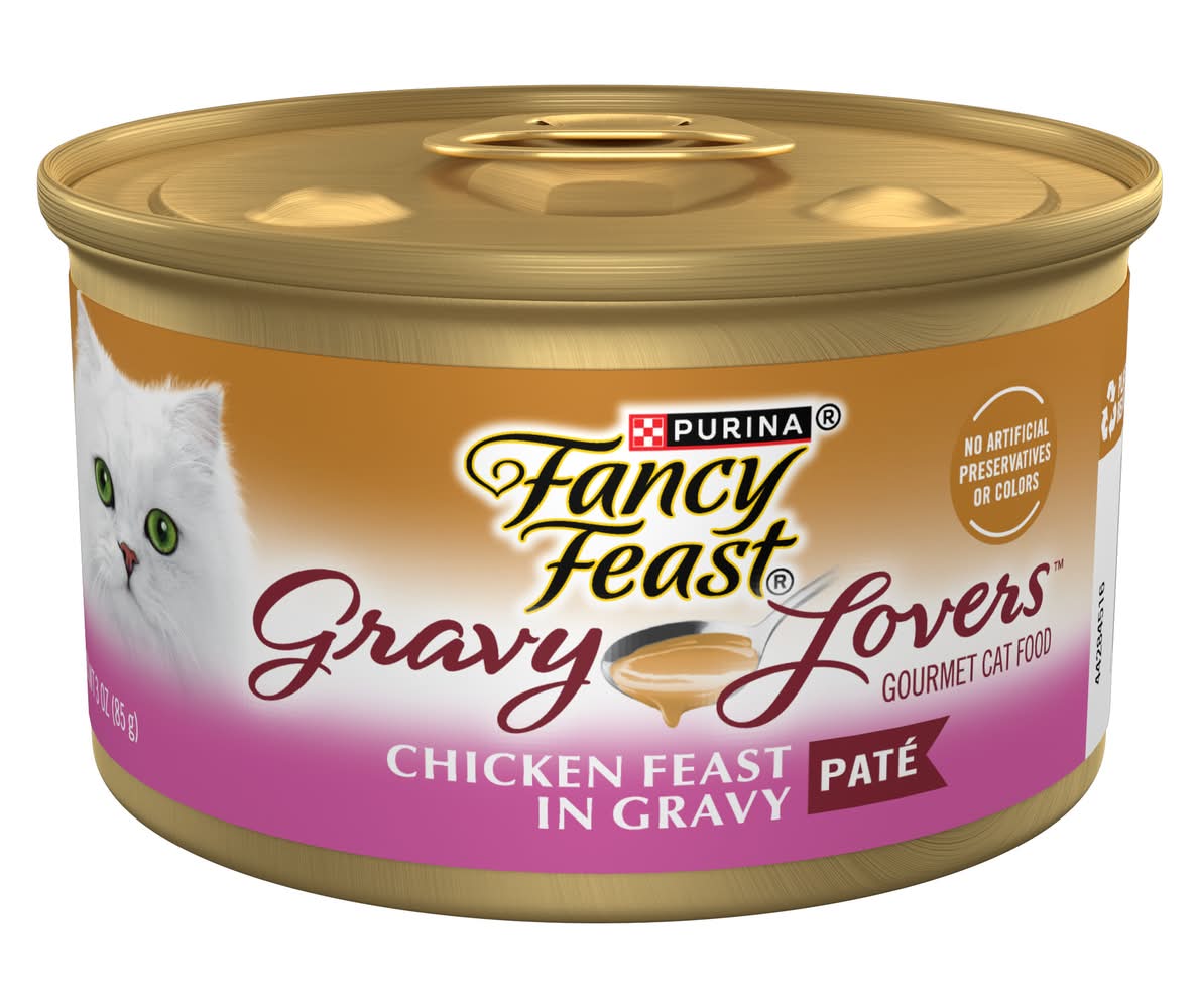 Delight your cat with an exceptional mealtime experience every time you open a can of Purina Fancy Feast Gravy Lovers Chicken Feast Pate in Gravy cat food. Crafted in partnership with our expert nutritionists, this protein-rich, Fancy Feast cat food features the irresistible taste of real chicken while delivering 100 percent complete and balanced nutrition for adult cats. This flavorful chicken feast pate in gravy cat food includes a blend of vitamins and minerals to support their whole body health, an alluring pate cat food texture and an enticing Gravy Lovers cat food taste for an unforgettable mealtime experience. This canned cat food is made without artificial colors or preservatives, so your cat gets everything they need and nothing they don’t. Show your cat you love them with the spellbinding aroma and irresistible gourmet meal flavor in this high-quality cat food pate in gravy. Each can is thoughtfully crafted and tested for quality and safety in Purina-owned U.S. facilities. Packaging: Reusable