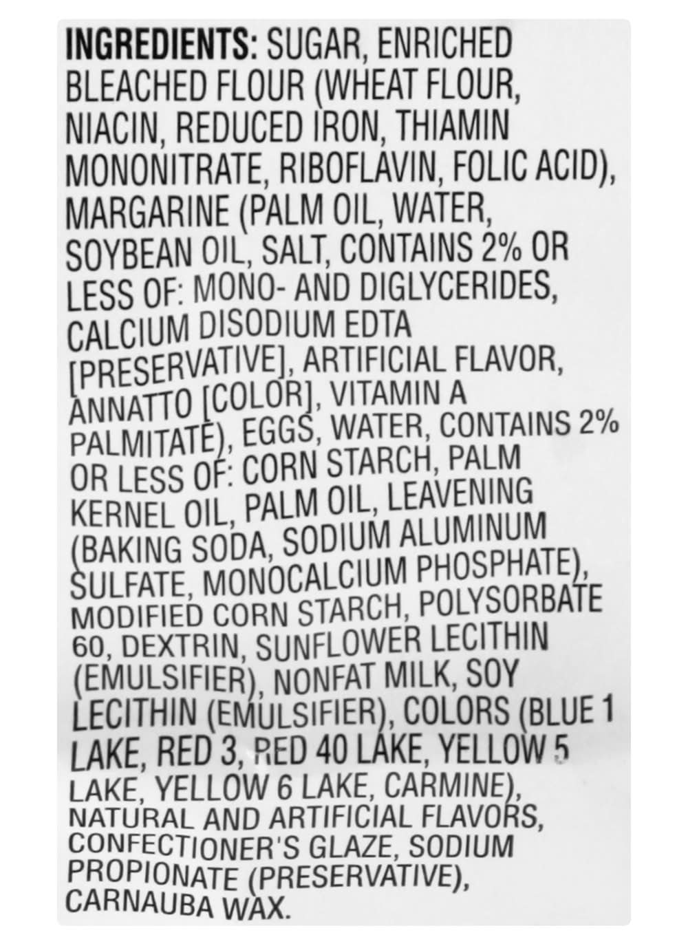 Ingredients: Sugar, Enriched Bleached Flour (Wheat Flour, Niacin, Reduced Iron, Thiamine Mononitrate, Riboflavin, Folic Acid), Margarine (Palm Oil, Water, Soybean Oil, Salt, Contains 2% or Less of: Mono- and Diglycerides, Calcium Disodium EDTA [Preservative], Artificial Flavor, Annatto [Color], Vitamin A Palmitate), Eggs, Water, Contains 2% or Less of: Corn Starch, Palm Kernel Oil, Palm Oil, Leavening (Baking Soda, Sodium Aluminum Sulfate, Monocalcium Phosphate), Modified Corn Starch, Polysorbate 60, Dextrin, Sunflower Lecithin (Emulsifier), Nonfat Milk, Soy Lecithin (Emulsifier), Colors (Blue 1 Lake, Red 3, Red 40 Lake, Yellow 5 Lake, Carmine), Natural and Artificial Flavors, Confectioner’s Glaze, Sodium Propionate (Preservative), Carnauba Wax. Contains: Wheat, Eggs, Milk, Soybeans