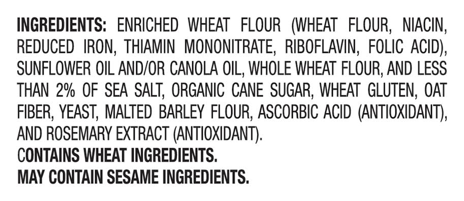 Ingredients: Enriched Wheat Flour (Wheat Flour, Niacin, Reduced Iron, Thiamin Mononitrate, Riboflavin, Folic Acid), Sunflower Oil and/or Canola Oil, Whole Wheat Flour, and Less than 2% of Sea Salt, Organic Cane Sugar, Wheat Gluten, Oat Fiber, Yeast, Malted Barley Flour, Ascorbic Acid (Antioxidant), and Rosemary Extract (Antioxidant) Contains: Wheat, Gluten, Barley, Oat, Sesame