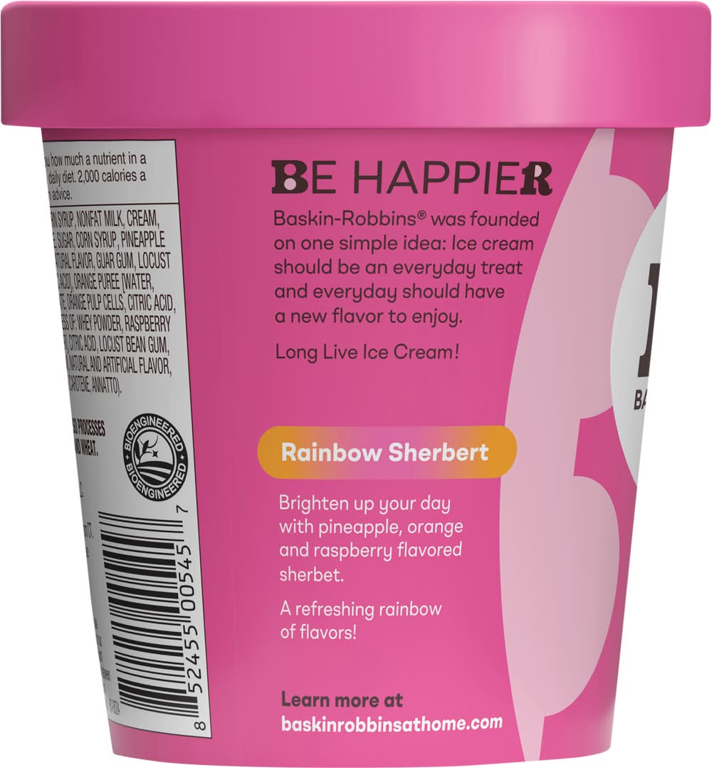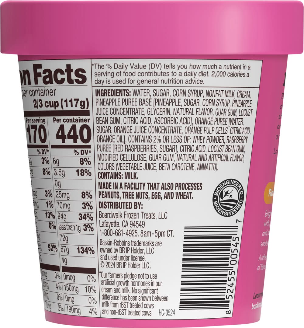 Ingredients: Water, Sugar, Corn Syrup, Nonfat Milk, Cream, Pineapple Puree Base [Pineapple, Sugar, Corn Syrup, Pineapple Juice Concentrate, Glycerin, Natural Flavor, Guar Gum, Locust Bean Gum, Citric Acid, Ascorbic Acid], Orange Puree [Water, Sugar, Orange Juice Concentrate, Orange Pulp Cells, Citric Acid, Orange Oil], Contains 2% or Less of: Whey Powder, Raspberry Puree [Red Raspberries, Sugar], Citric Acid, Locust Bean Gum, Modified Cellulose, Guar Gum, Natural and Artificial Flavor, Colors (Vegetable Juice, Beta Carotene, Annatto) Contains: Milk