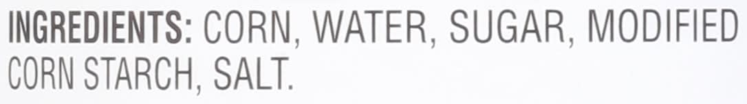 Ingredients: Corn, Water, Sugar, Modified Corn Starch, Salt. Contains: Corn