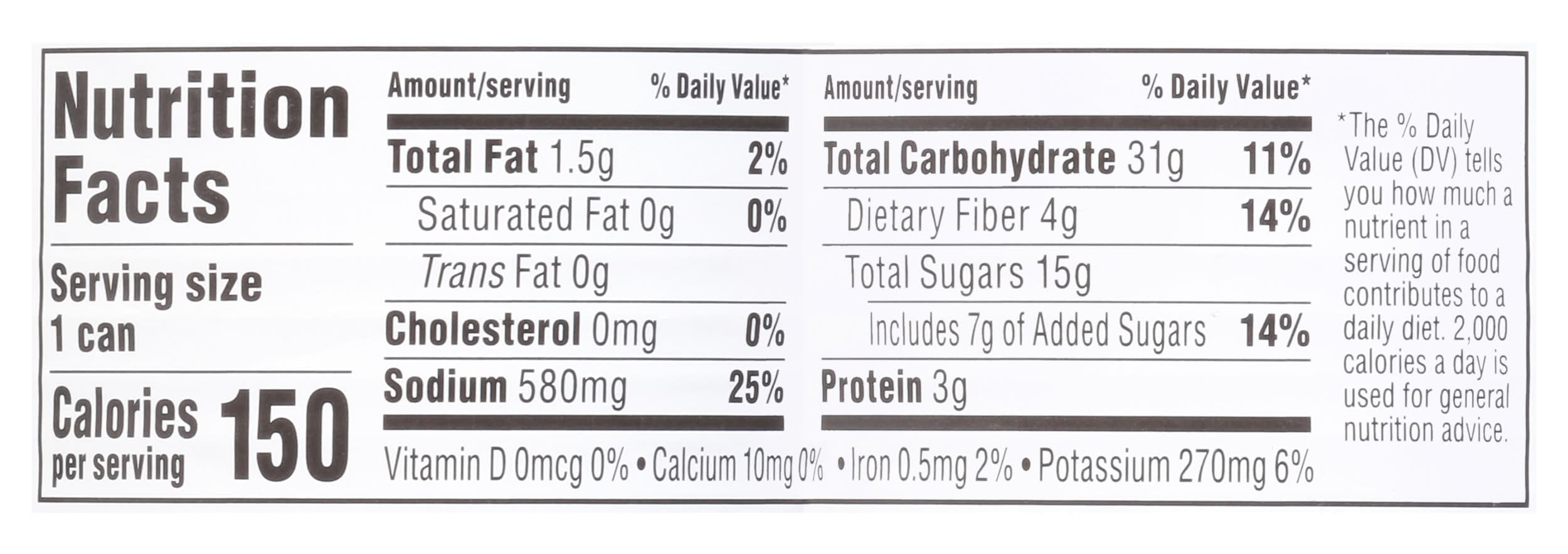 Per Can: 150 calories; 0 g sat fat (0% DV); 580 mg sodium (25% DV); 15 g total sugars. Quality guaranteed. Our promise, quality & satisfaction 100% guaranteed or your money back. www.betterlivingbrandsLLC.com. how2recycle.info. SmartLabel: Scan for more food information or call 1-888-723-3929. Non-BPA lining (Can lining produced without the intentional addition of BPA). • Better Living Brands LLC, PO Box 99, Pleasanton, CA, 94566-0009 • Packaging: Reusable