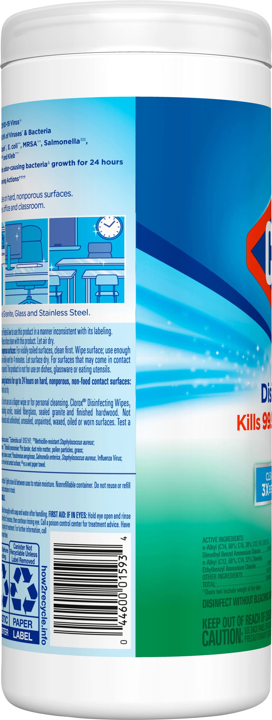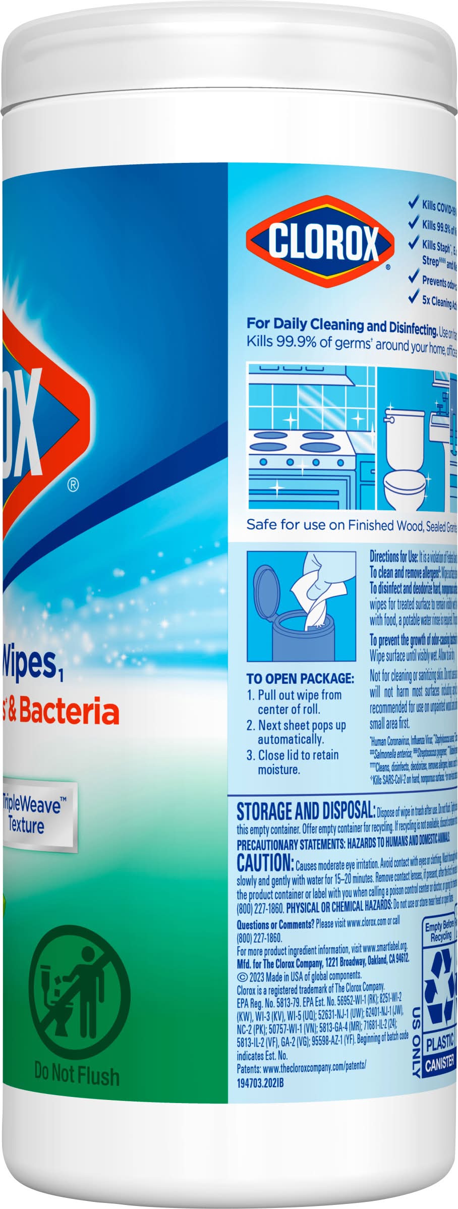 Directions for use: Do not flush. Directions for Use: It is a violation of Federal law to use this product in a manner inconsistent with its labeling. To clean and remove allergens. Wipe surface clean with this product. Let air dry. To disinfect and deodorize hard, nonporous surfaces: For visibly soiled surfaces, clean first. Wipe surface; use enough wipes for treated surface to remain visibly wet for 4 minutes. Let surface dry. For surfaces that may come in contact with food, a potable water rinse is required. This product is not for use on dishes, glassware or eating utensils. To prevent the growth of odor-causing bacteria for up to 24 hours on hard, nonporous, non-food contact surfaces: Wipe surface until visibly wet. Allow to air dry. Not for cleaning or sanitizing skin. Do not use as a diaper wipe or for personal cleansing. Clorox Disinfecting Wipes will not harm most surfaces including acrylic, sealed fiberglass, sealed granite and finished hardwood. Not recommended for use on unpainted wood and unfinished, unsealed, unpainted, waxed, oiled or worn surfaces. Test a small area first. Pet dander, dust mite matter, pollen particles, grass. Storage recommendation: Storage and Disposal: Dispose of wipe in trash after use. Do not flush. Tightly close lid between uses to retain moisture. Nonrefillable container. Do not reuse or refill this empty container. Offer empty container for recycling. If recycling is not available, discard container in trash.