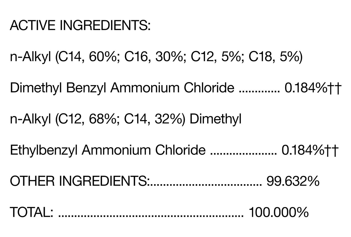 Ingredients: ACTIVE INGREDIENTS: n-Alkyl (C14, 60%; C16, 30%; C12, 5%; C18, 5%) Dimethyl Benzyl Ammonium Chloride: 0.184%**; n-Alkyl (C12, 68%; C14, 32%) Dimethyl Ethylbenzyl Ammonium Chloride: 0.184%**; OTHER INGREDIENTS: 99.632%; TOTAL: 100.000%; **Does not include weight of dry wipe