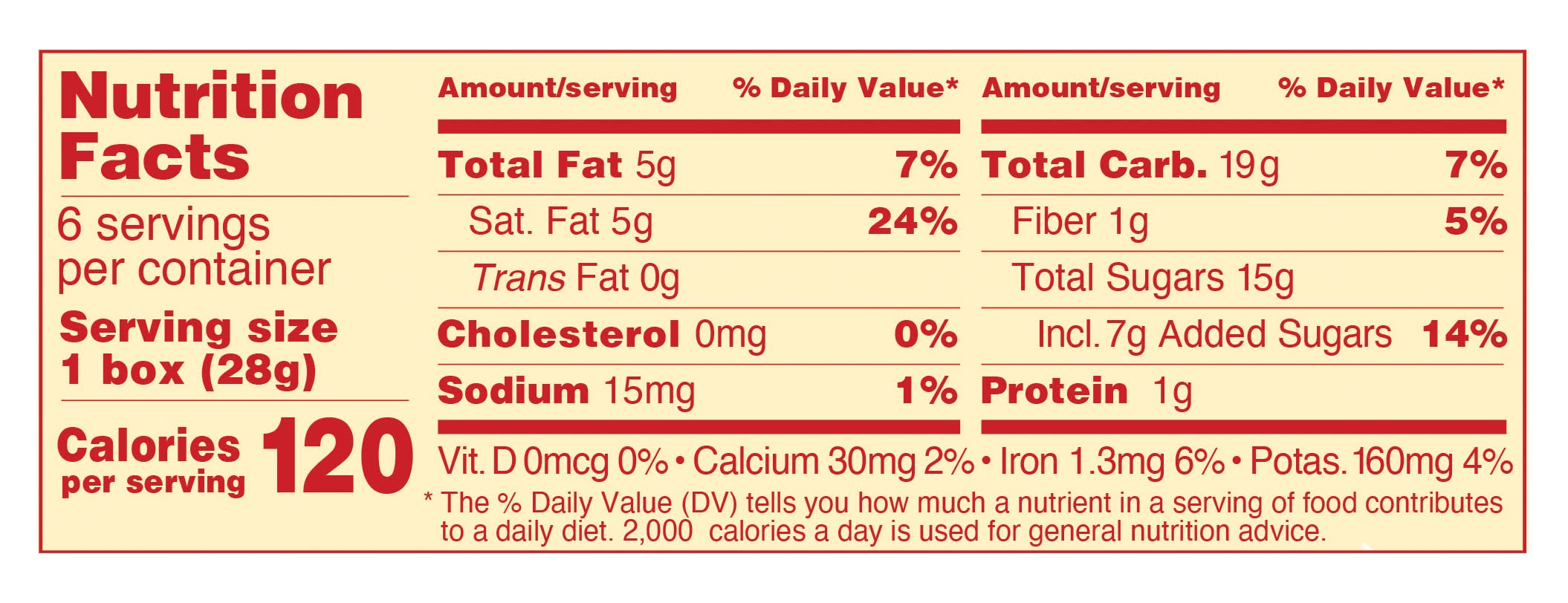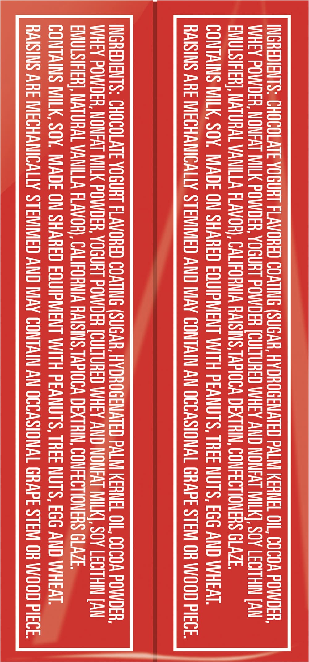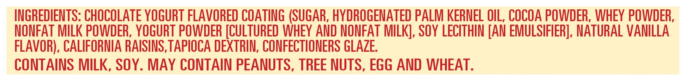 Ingredients: Chocolate Yogurt Flavored Coating (Sugar, Hydrogenated Palm Kernel Oil, Cocoa Powder, Whey Powder, Nonfat Milk Powder, Yogurt Powder [Cultured Whey and Nonfat Milk], Soy Lecithin [an Emulsifier], Natural Vanilla Flavor), California Raisins, Tapioca Dextrin, Confectioners Glaze Contains: Milk, Soybeans, Peanuts, Tree Nuts, Eggs, Wheat