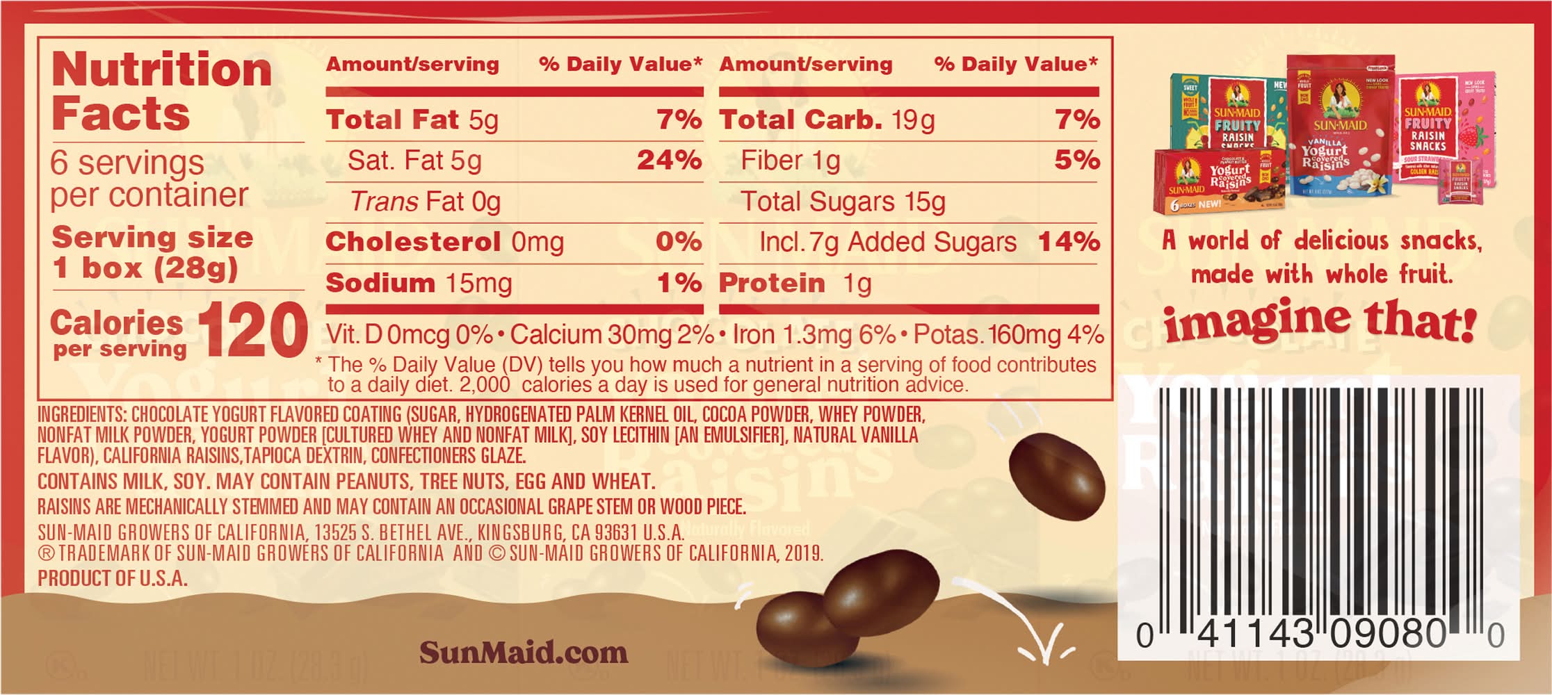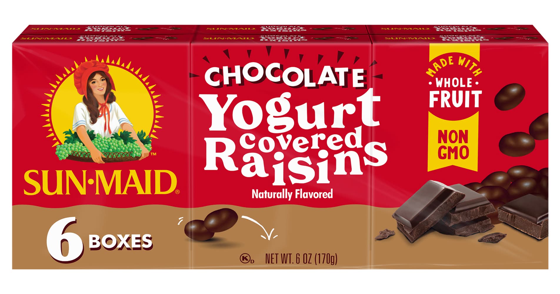 Chocolate Yogurt Covered Raisins 6-Pack/1oz Cartons Sun-Maid Growers of California, 13525 S. Bethel Ave,Kingsburg,CA,93631,USA