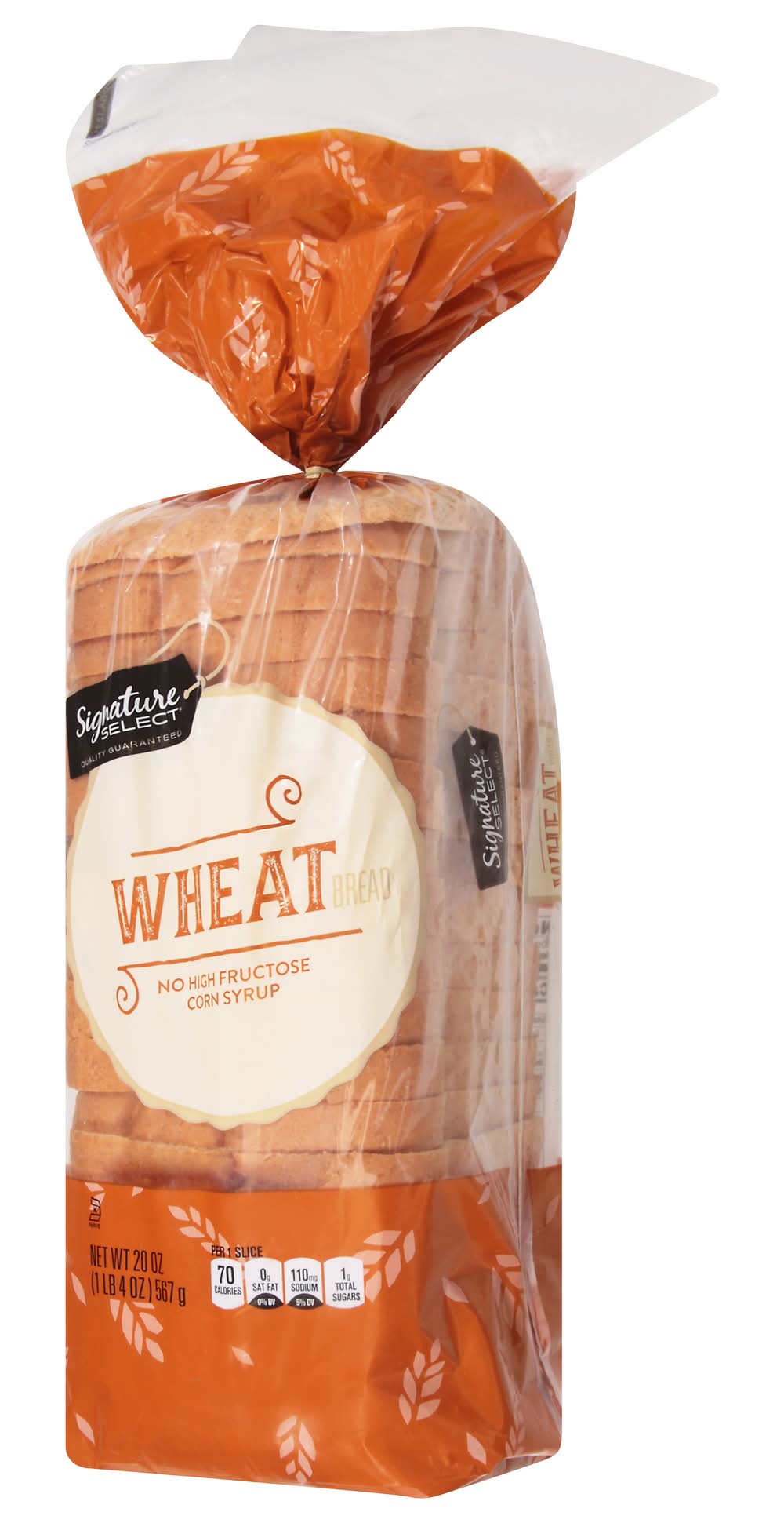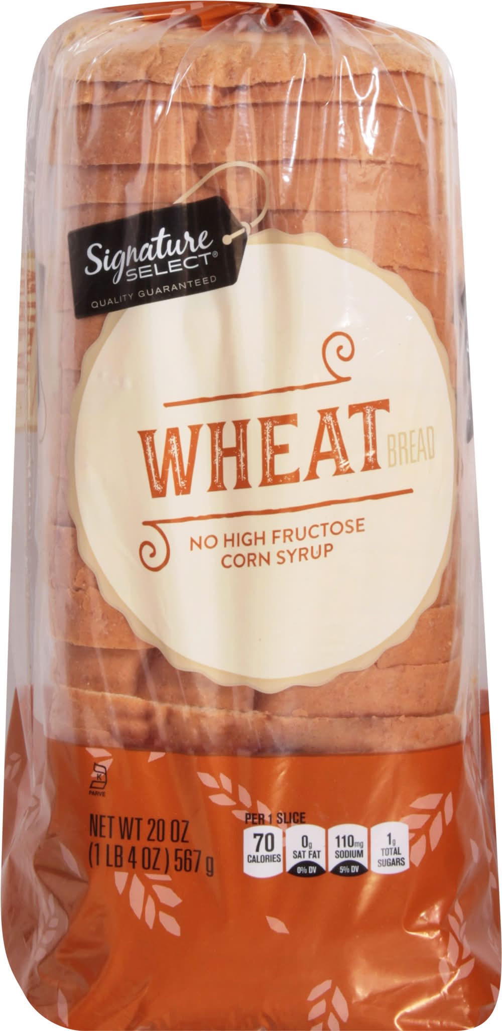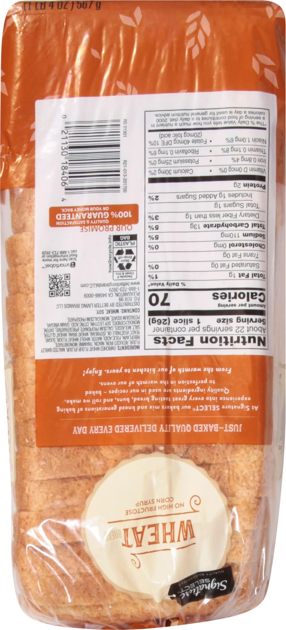 Per 1 Slice: 70 calories; 0 g sat fat (0% DV); 110 mg sodium (5% DV); 1 g total sugars. No high fructose corn syrup. Just-Baked Quality Delivered Every Day: At Signature Select our bakers mix and knead generations of baking experience into every tasting bread, buns, and roll we make. Quality ingredients are sued in our recipes - baked to perfection in the warmth of our ovens. From the warmth of our kitchen to yours. Enjoy! Quality Guaranteed. • Better Living Brands LLC, PO Box 99,Pleasnton,CA,94566-0009 • Packaging: Reusable