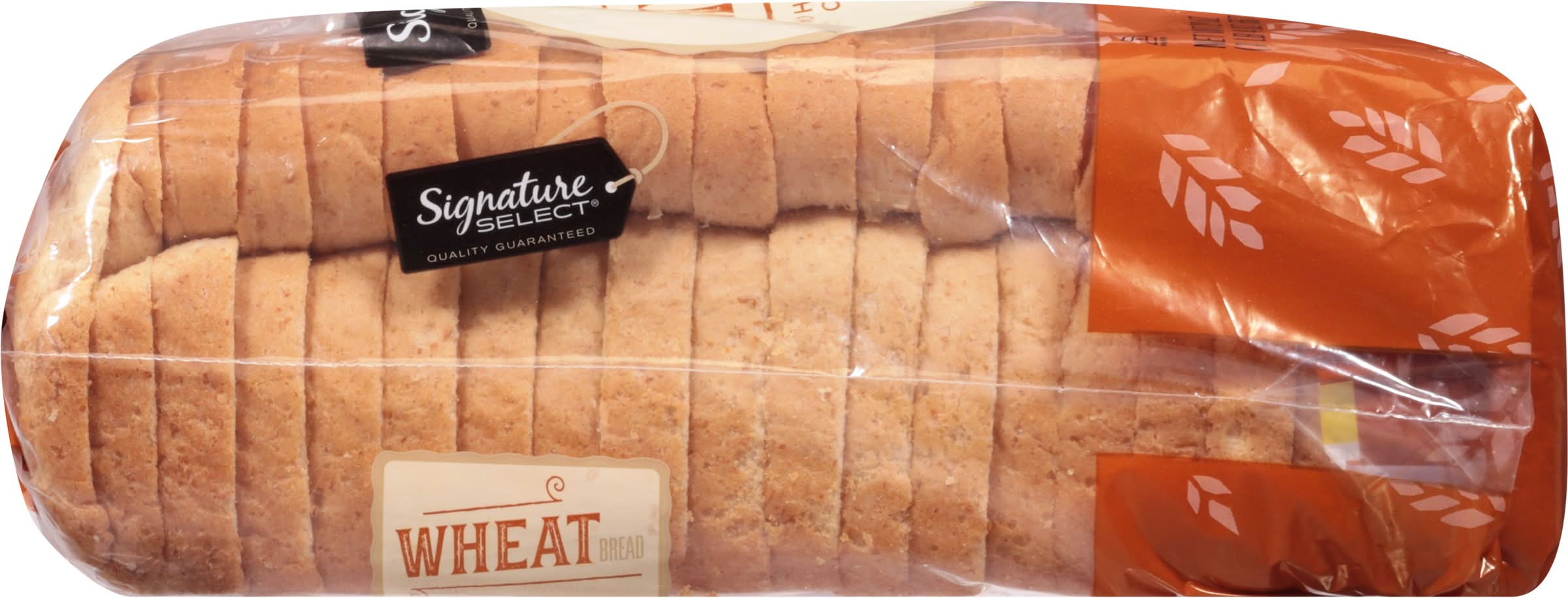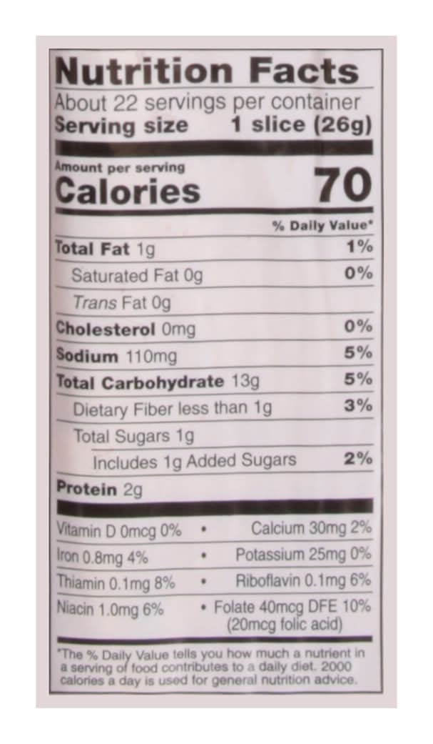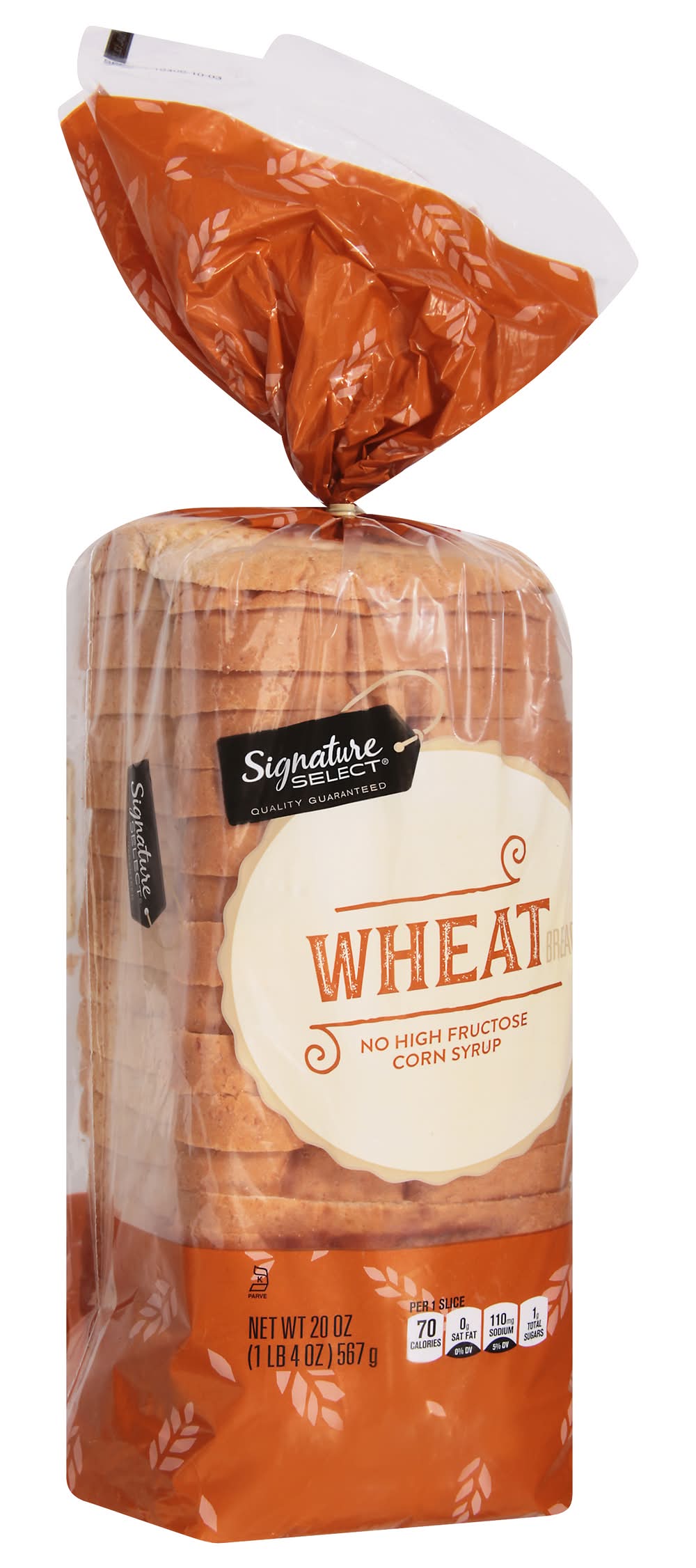 Per 1 Slice: 70 calories; 0 g sat fat (0% DV); 110 mg sodium (5% DV); 1 g total sugars. No high fructose corn syrup. Just-Baked Quality Delivered Every Day: At Signature Select our bakers mix and knead generations of baking experience into every tasting bread, buns, and roll we make. Quality ingredients are sued in our recipes - baked to perfection in the warmth of our ovens. From the warmth of our kitchen to yours. Enjoy! Quality Guaranteed. • Better Living Brands LLC, PO Box 99,Pleasnton,CA,94566-0009 • Packaging: Reusable