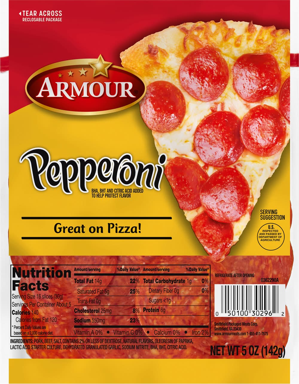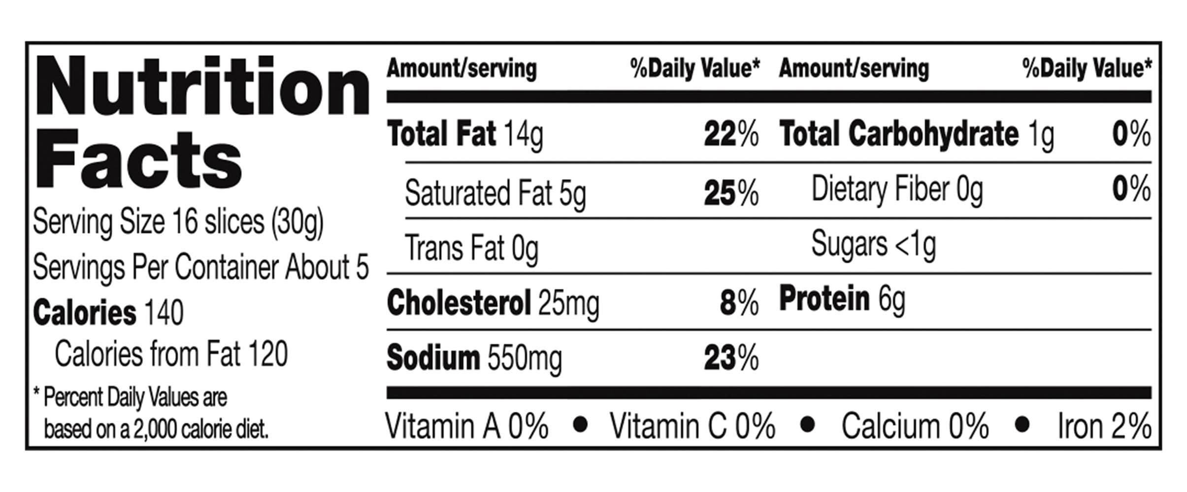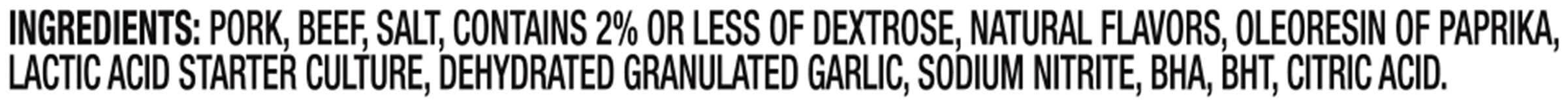 Ingredients: Pork, Beef, Salt, Contains 2% or Less of Dextrose, Natural Flavors, Oleoresin of Paprika, Lactic Acid Starter Culture, Dehydrated Granulated Garlic, Sodium Nitrite, BHA, BHT, Citric Acid