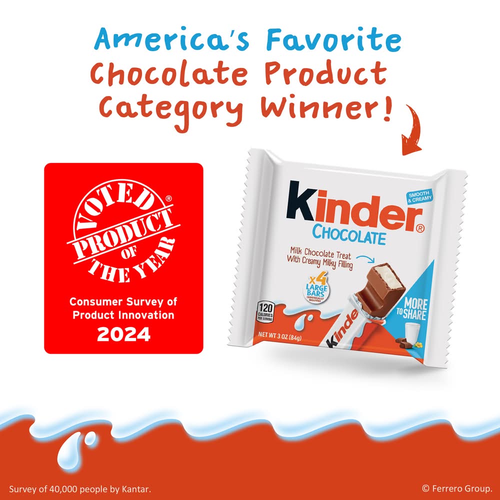 Enjoy smooth milk chocolate with a creamy, milky filling and discover the irresistible taste of Chocolate in this pack of 4 shareable, large chocolate bars. Individually wrapped and perfectly portioned, Chocolate bars are great for sharing the delicious, creamy taste of with the ones you love. With Chocolate, little things really can mean a lot. That's why every bar is made without artificial colors and preservatives. Crafted for kids, loved and shared by all. For over 70 years, Ferrero has created products loved by generations. We've grown from a bakery in Alba, Italy, into a confectionery company loved around the world. We're committed to helping people celebrate life's special moments with high-quality products. Based upon a survey of 40,000 people by Kantar for America’s favorite chocolate product category.