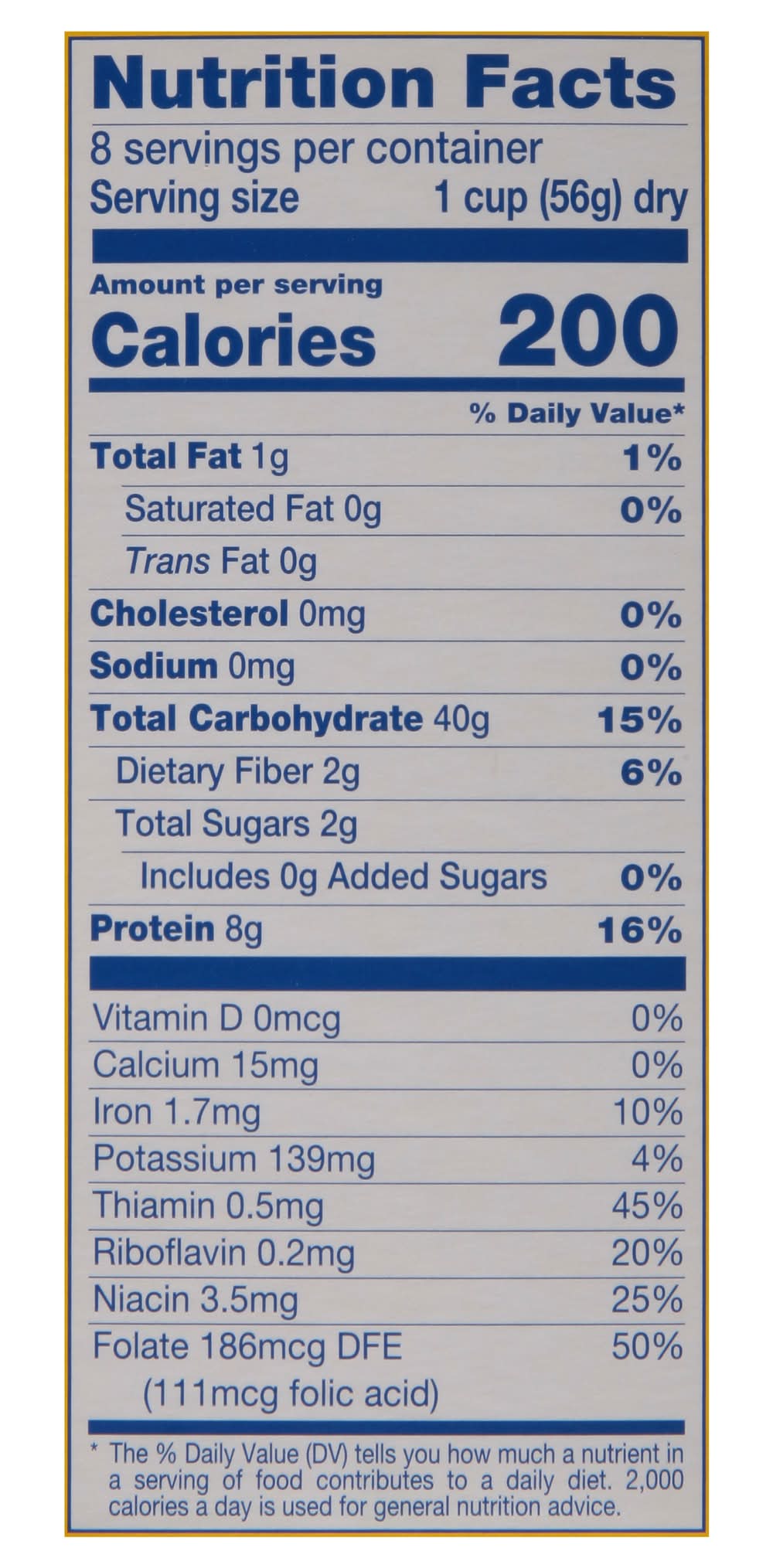 Ingredients: Durum, Wheat, Semolina, Vitamins (Niacin, Thiamine Mononitrate, Riboflavin, Folic Acid), Iron (Ferrous Lactate) Contains: Wheat, Soybeans