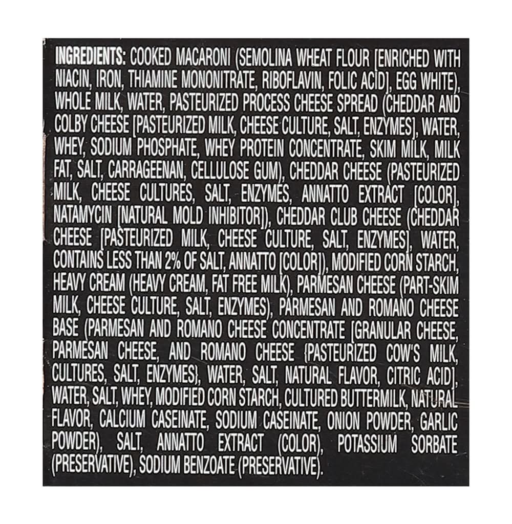 Ingredients: Cooked Macaroni (Semolina Wheat Flour [Enriched with Niacin, Iron, Thiamine Mononitrate, Riboflavin, Folic Acid], Egg White), Whole Milk, Water, Pasteurized Process Cheese Spread (Cheddar and Colby Cheese [Pasteurized Milk, Cheese Culture, Salt, Enzymes], Water, Whey, Sodium Phosphate, Whey Protein Concentrate, Skim Milk, Milk Fat, Salt, Carrageenan, Cellulose Gum), Cheddar Cheese (Pasteurized Milk, Cheese Cultures, Salt, Enzymes, Annatto Extract [Color], Natamycin [Natural Mold Inhibitor]), Cheddar Club Cheese (Cheddar Cheese [Pasteurized Milk, Cheese Culture, Salt, Enzymes], Water, Contains Less than 2% of Salt, Annatto [Color]), Modified Corn Starch, Heavy Cream (Heavy Cream, Fat Free Milk), Parmesan Cheese (Part-Skim Milk, Cheese Culture, Salt, Enzymes), Parmesan and Romano Cheese Base (Parmesan and Romano Cheese Concentrate [Granular Cheese, Parmesan Cheese, and Romano Cheese {Pasteurized Cow's Milk, Cultures, Salt, Enzymes}, Water, Salt, Natural Flavor, Citric Acid], Water, Salt, Whey, Modified Corn Starch, Cultured Buttermilk, Natural Flavor, Calcium Caseinate, Sodium Caseinate, Onion Powder, Garlic Powder), Salt, Annatto Extract (Color), Potassium Sorbate (Preservative), Sodium Benzoate (Preservative) Contains: Wheat, Eggs, Milk, Corn