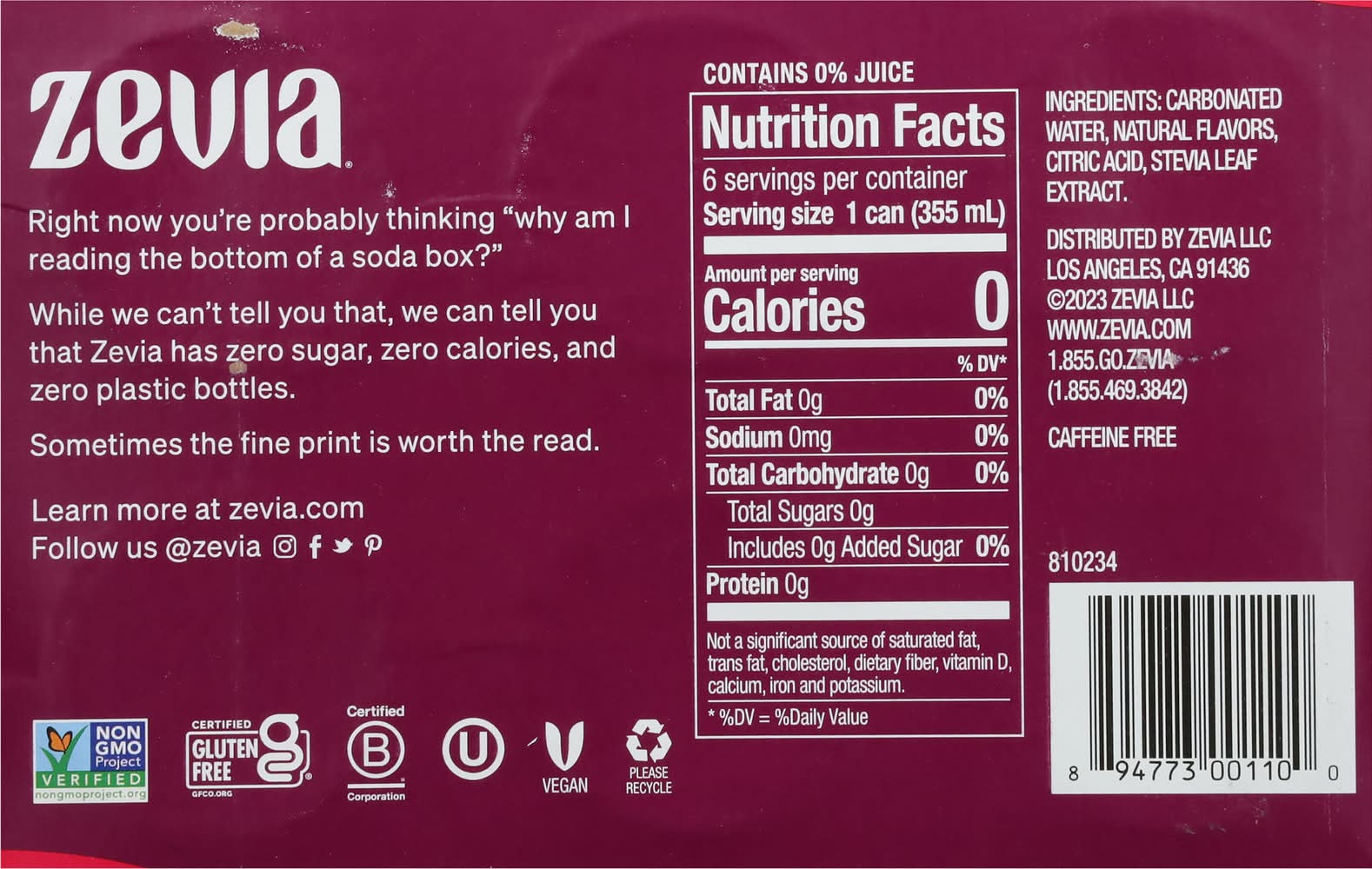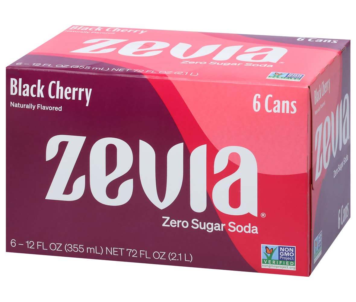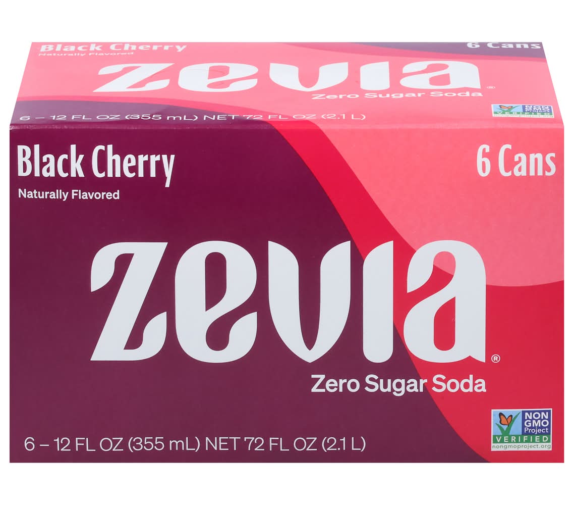 • Flavor: Black cherry • Pack size: 6 • Zevia, LLC, Los Angeles, CA, 91436 • Packaging: Reusable