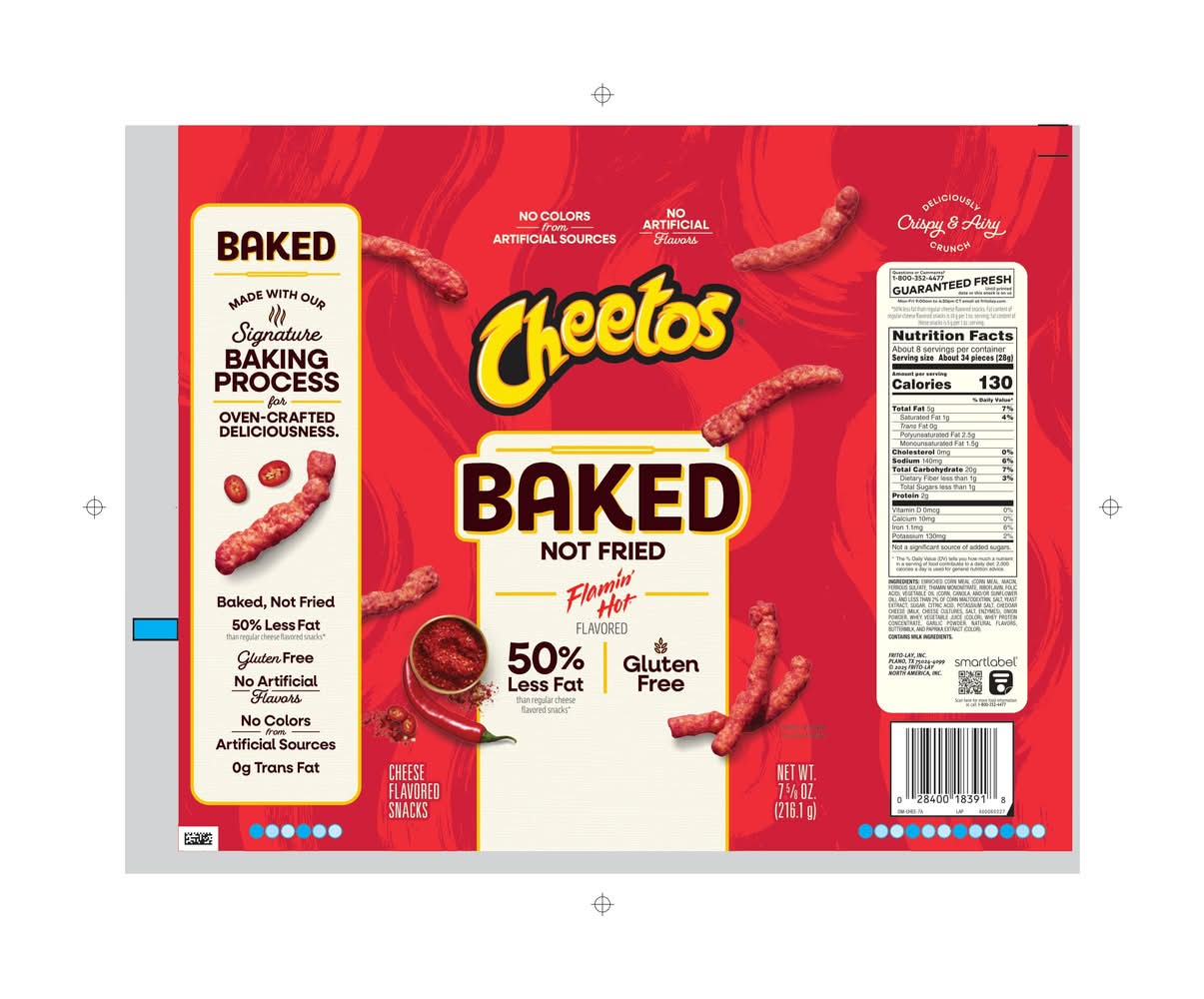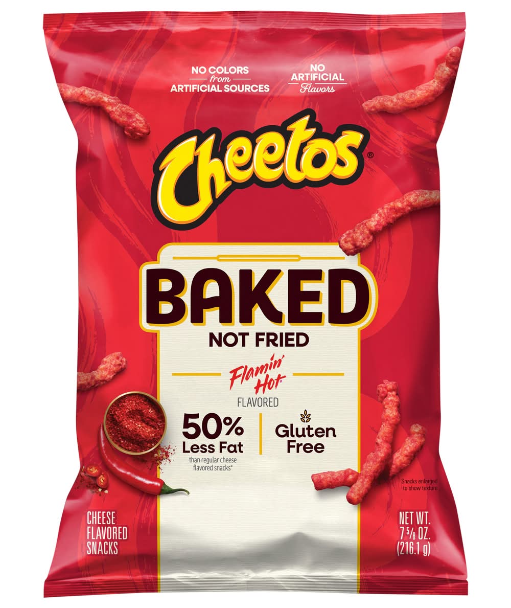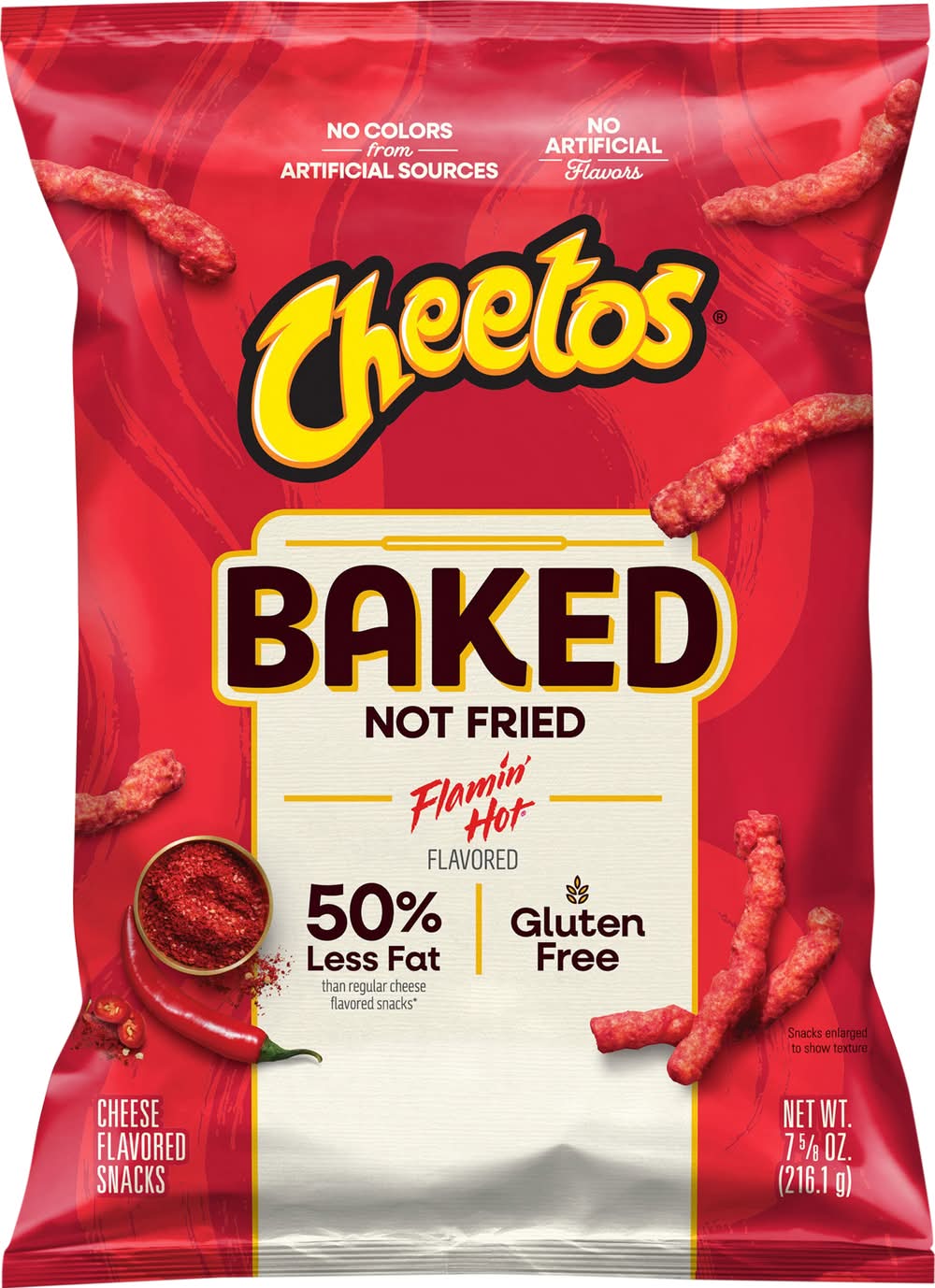 Made with real cheese. No artificial flavors. 0 g trans fat. Gluten free. 50% less fat than regular cheese flavored snacks. Fat contents of regular cheese flavored snacks is 10 g per 1 oz serving, fat content of these snacks is 5 g per 1 oz serving. • Flavor: Flamin hot cheese • Frito-Lay, Inc., Plano,TX,75024-4099