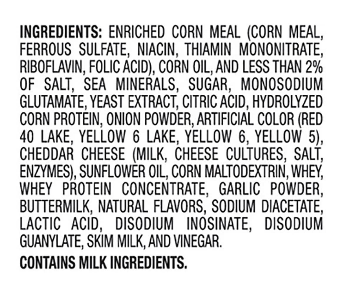 Ingredients: Enriched Corn Meal (Corn Meal, Niacin, Ferrous Sulfate, Thiamin Mononitrate, Riboflavin, Folic Acid), Vegetable Oil (Corn, Canola, and/or Sunflower Oil), and Less than 2% of Corn Maltodextrin, Salt, Yeast Extract, Sugar, Citric Acid, Potassium Salt, Cheddar Cheese (Milk, Cheese Cultures, Salt, Enzymes), Onion Powder, Whey, Vegetable Juice (Color), Whey Protein Concentrate, Garlic Powder, Natural Flavors, Buttermilk, and Paprika Extract (Color) Contains: Milk
