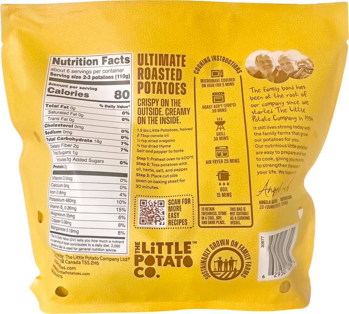 Naturally buttery. Light creamy texture. 70 calories (per 110 g serving). Good source of potassium. 5 min. Pre washed. No peeling. Since 1996, we have harvested our special creamer potato varieties that are at their nutritional best, richest in flavor and texture. As a mother, I promise to provide delightful, easy food that you will feel good to share with others