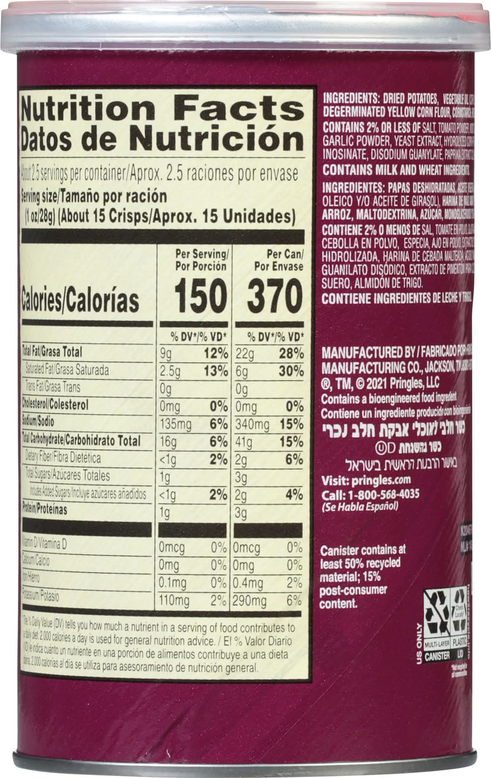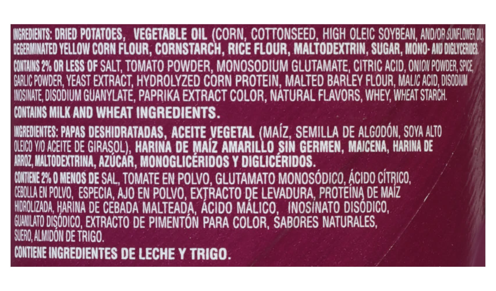 Ingredients: Dried Potatoes, Vegetable Oil (Corn Cottonseed High Oleic Soybean and/or Sunflower Oil), Degerminated Yellow Corn Flour, Cornstarch, Rice Flour, Maltodextrin, Sugar, Mono- and Diglycerides, Contains 2% or Less of Salt, Tomato Powder, Monosodium Glutamate, Citric Acid, Onion Powder, Spice, Garlic Powder, Yeast Extract, Hydrolyzed Corn Protein, Malted Barley Flour, Malic Acid, Disodium Inosinate, Disodium Guanylate, Paprika Extract Color, Natural Flavors, Whey, Wheat Starch Contains: Corn, Soybeans, Barley, Wheat