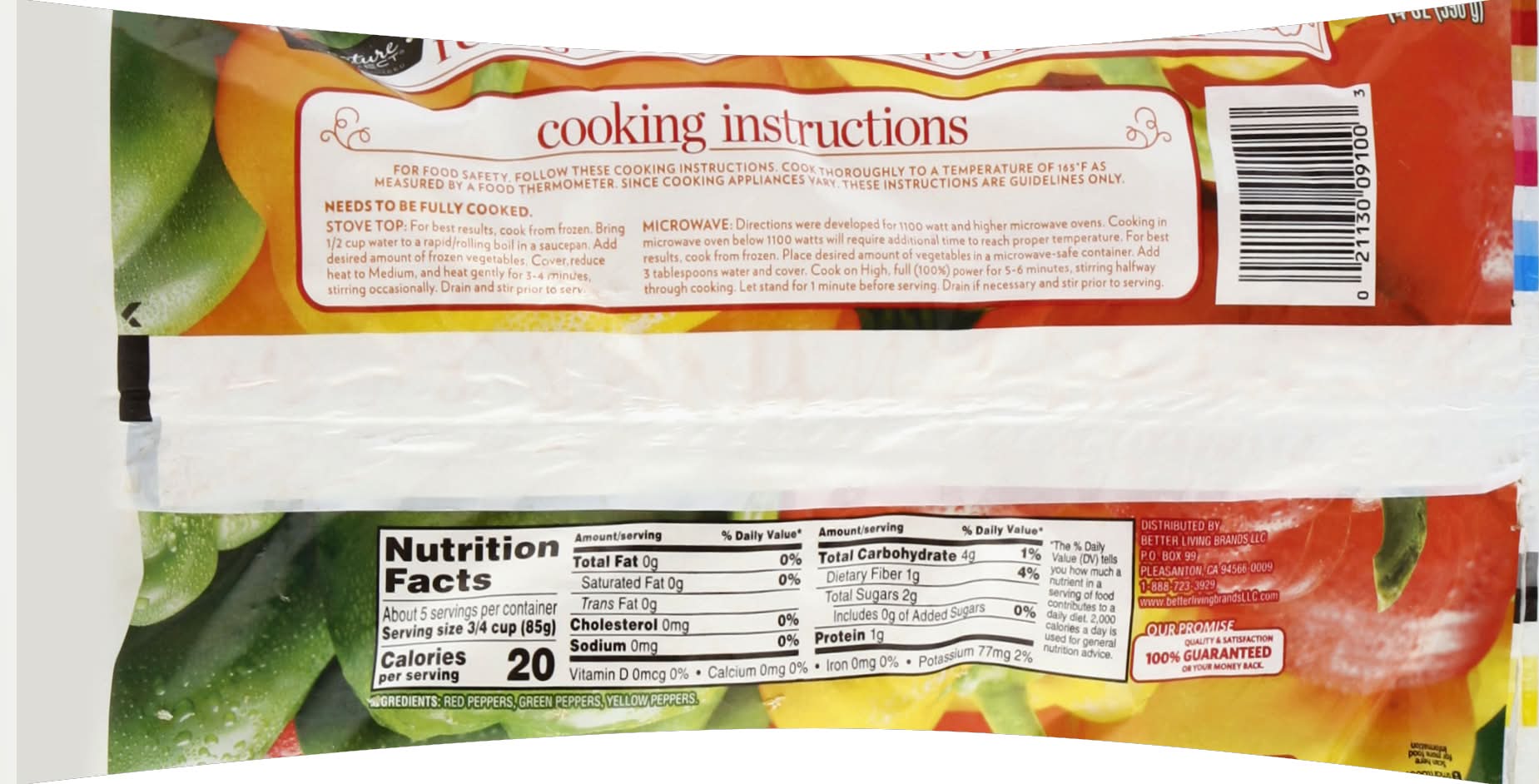 Directions: perishable. keep frozen. cook thoroughly. cooking instructions: for food safety, follow these cooking instructions. cook thoroughly to an internal temperature of 165 degrees f as measured by a food thermometer. since cooking appliances vary, these instructions are guidelines only. stove top: for every cup of pepper strips, bring 1/4 cup water to a boil. add pepper strips, bring to boil, cover and simmer until tender 3-5 minutes. microwave: in a microwave-safe bowl, add 2 tablespoons water to package of pepper strips. microwave covered, on high 3-5 minutes, stirring once. steaming: place pepper strips in steamer over boiling water. cover and steam until tender, stirring once. 1-1/2 cups of pepper strips will take about 3-4 minutes.