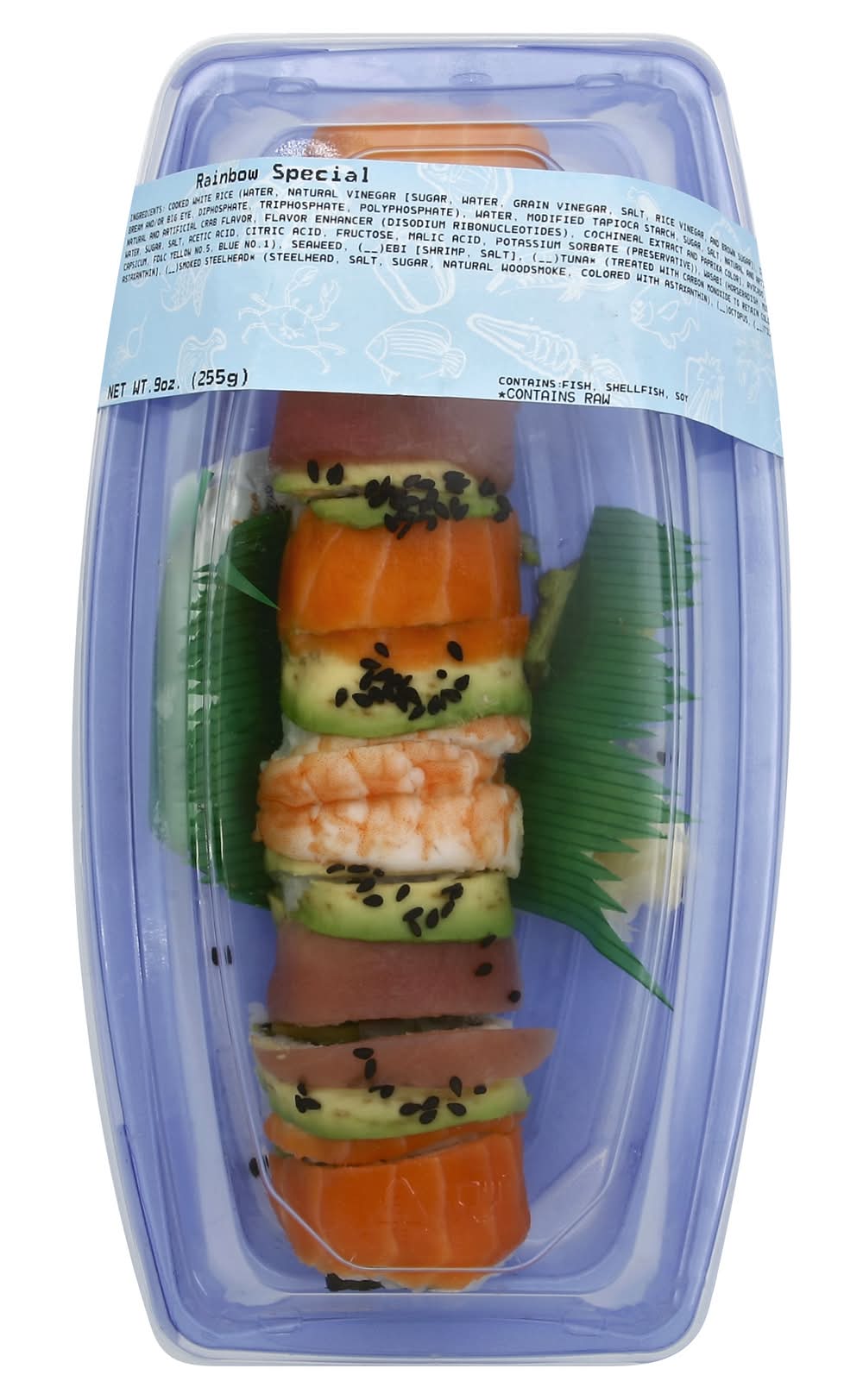 Ingredients: Cooked White Rice (Water Natural Vinegar [Sugar Water Grain Vinegar Salt Rice Vinegar and Brown Sugar]), Imitation Crab [Surimi (Threadfin Bream and/or Big Eye Diphosphate Triphosphate Polyphosphate), Water, Modified Tapioca Starch, Sugar, Salt, Natural and Artificial Crab Extract (Soy Sauce), Natural and Artificial Crab Flavor, Flavor Enhancer (Disodium Ribonucleotides), Cochineal Extract and Paprika Color], Avocado, Cucumber, Pickled Ginger (Ginger Water Salt Acetic Acid Citric Acid Fructose Malic Acid Potassium Sorbate (Preservative)), Wasabi (Horseradish Mustard Corn Flour Citric Acid Capsicum FD&C Yellow 5 Blue 1), Seaweed, Ebi [Shrimp, Salt], Tuna (Contains Raw) (Treated with Carbon Monoxide to Retain Color), Steelhead (Contains Raw) (Colored with Astaxanthin] Smoke Steelhead (Contains Raw) (Steelhead Salt Sugar Natural Woodsmoke Colored with Astaxanthin), Octopus, Tilapia (Contains Raw) Contains: Fish, Soybeans