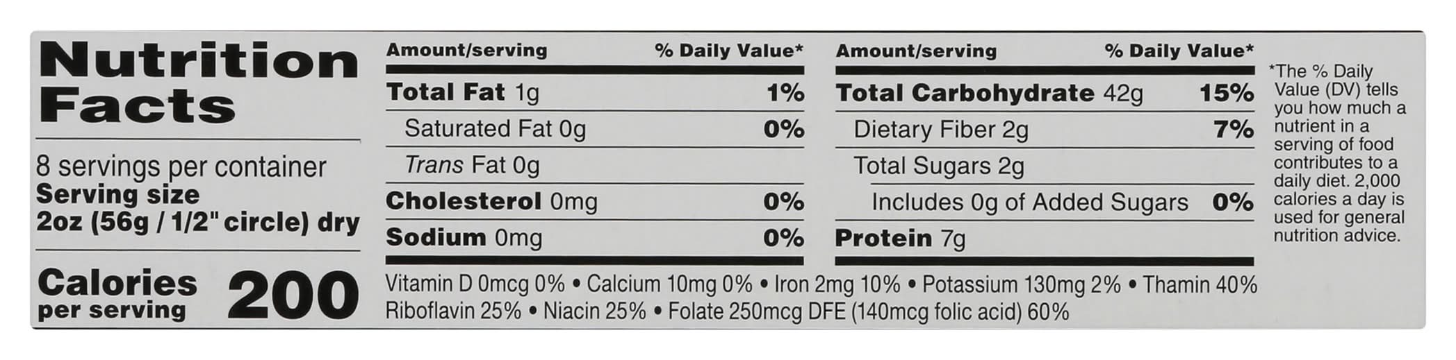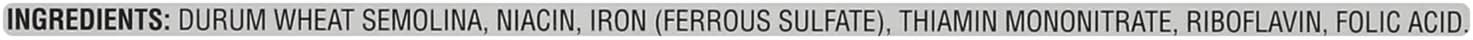 Ingredients: Durum Wheat Semolina, Niacin, Iron (Ferrous Sulfate), Thiamin Mononitrate, Riboflavin, Folic Acid. Contains: Wheat