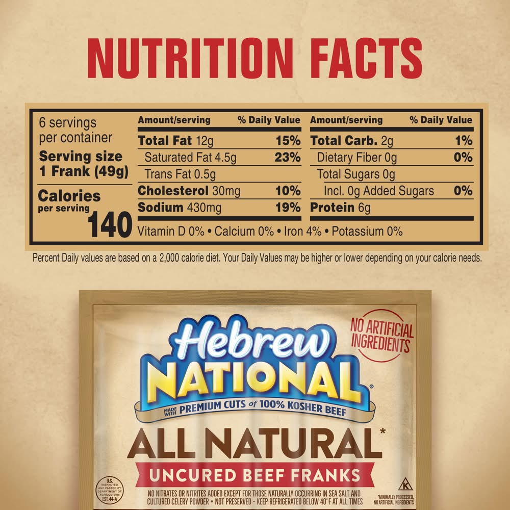 Hebrew National All Natural Uncured Beef Franks start with premium cuts of 100% kosher beef and a original spice blend dating back to 1905 for the delicious flavor that families have loved for generations. Every bite of these uncured franks gives you all the great taste and quality you expect from Hebrew National Hot Dogs but without the added ingredients you don't want. Each beef frank is gluten free and made with no added nitrates or nitrites (except those naturally occurring in sea salt and cultured celery powder), and contains 6 grams of protein and 140 calories per serving. Serve Hebrew National uncured hot dogs at barbecues, family cookouts or as part of a quick lunch or family dinner. Simply serve the beef hot dog in a bun and add your favorite toppings. Grill, microwave or boil these natural hot dogs in minutes for part of a delicious and quick meal. Store this six count pack of kosher hot dogs in your refrigerator. Hebrew National has provided premium-quality, great-tasting meats trusted by generations of families since 1905. Minimally processed with no artificial ingredients.