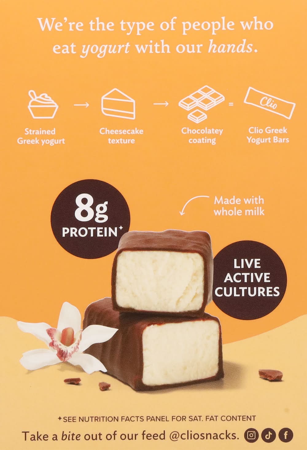 8g protein. Strained Greek yogurt, Cheesecake texture, Chocolatey coating, Clio Greek Yogurt Bars. • Flavor: Vanilla • Pack size: 4