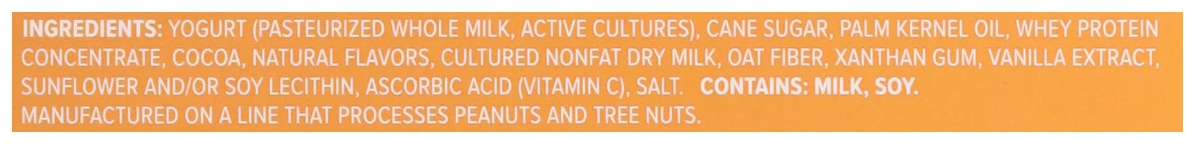 Ingredients: Yogurt (Pasteurized Whole Milk, Active Cultures), Cane Sugar, Palm Kernel Oil, Whey Protein Concentrate, Cocoa, Natural Flavors, Cultured Nonfat Dry Milk, Oat Fiber, Xanthan Gum, Vanilla Extract, Sunflower and/or Soy Lecithin, Ascorbic Acid (Vitamin C), Salt. Live and Active Cultures [L. Bulgaricus, S. Thermophilus] Contains: Milk, Soybeans, Oat, Peanuts, Tree Nuts