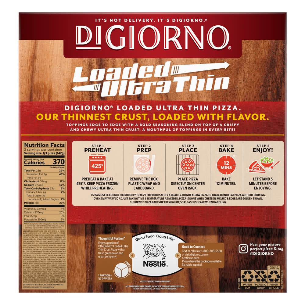 DiGiorno Loaded Ultra Thin Carnivore Pizza is a meat lover’s pizza crafted for moments when regular frozen pizza just won’t cut it. Layered edge-to-edge with four different types of meat: pepperoni, sausage, Canadian bacon, and beef pizza topping— our thinnest crust yet gives you that crispy and chewy texture. With 100% real cheese, bold seasoning, and 19g of protein per serving, this frozen thin crust pizza delivers on richness and flavor. Whether it’s a quick weeknight meal or a casual hangout with friends, this frozen pizza is ready in just 12 minutes. No prep, no stress, just pizzeria quality experience straight from your own oven. This four meat pizza is a game changer for easy family meals and delivers on delicious every time because… “It’s Not Delivery. It’s DiGiorno.” Packaging: Reusable