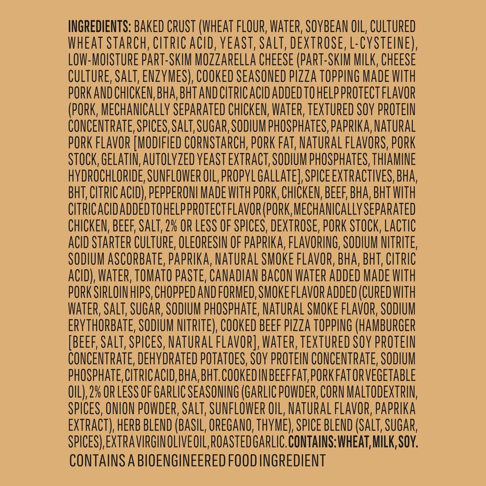Ingredients: Low-Moisture Part-Skim Mozzarella Cheese (Part-Skim Milk, Cheese Culture, Salt, Enzymes), Wheat Flour, Water, Cooked Seasoned Pizza Topping Made with Pork and Chicken, BHA, BHT and Citric Acid Added to Help Protect Flavor (Pork, Mechanically Separated Chicken, Water, Textured Soy Protein Concentrate, Spices, Salt, Sugar, Sodium Phosphates, Paprika, Natural Pork Flavor [Modified Cornstarch, Pork Fat, Natural Flavors, Pork Stock, Gelatin, Autolyzed Yeast Extract, Sodium Phosphates, Thiamine Hydrochloride, Sunflower Oil, Propyl Gallate], Spice Extractives, BHA, BHT, Citric Acid), Pepperoni Made with Pork, Chicken and Beef (Pork, Mechanically Separated Chicken, Beef, Salt, Contains 2% or Less of Spices, Dextrose, Pork Stock, Lactic Acid Starter Culture, Oleoresin of Paprika, Flavoring, Sodium Nitrite, Sodium Ascorbate, Paprika, Processed with Natural Smoke Flavor, BHA, BHT, Citric Acid to Help Protect Flavor), Tomato Paste, Cooked Beef Pizza Topping (Beef, Water, Textured Soy Protein Concentrate, Potato Flour, Contains 2% or Less of Salt, Hydrolyzed Corn Protein, Soy Protein and Wheat Protein, Corn Syrup Solids, Maltodextrin, Spice, Natural Grill Flavor [from Sunflower Oil], Garlic Powder, Cooked in Pork Fat or Beef Fat or Vegetable Oil), Smoked Ham Water Added, Smoke Flavor Added (Cured with Water, Salt, Potassium Lactate, Sugar, Sodium Phosphates, Smoke Flavoring, Sodium Ascorbate, Sodium Nitrite), 2% or Less of Vegetable Oil (Soybean Oil and/or Corn Oil and/or Palm Oil), Savory Garlic Seasoning (Garlic Powder, Corn Maltodextrin, Spices, Onion Powder, Salt, Sunflower Oil, Natural Flavor, Paprika Extract), Cultured Wheat and Citric Acid (to Preserve Freshness), Basil, Extra Virgin Olive Oil, Salt, Garlic, Yeast, Sugar, Oregano, Thyme, Dextrose, L-Cysteine (Dough Conditioner), Spices. Contains: CONTAINS: WHEAT, MILK, SOY.