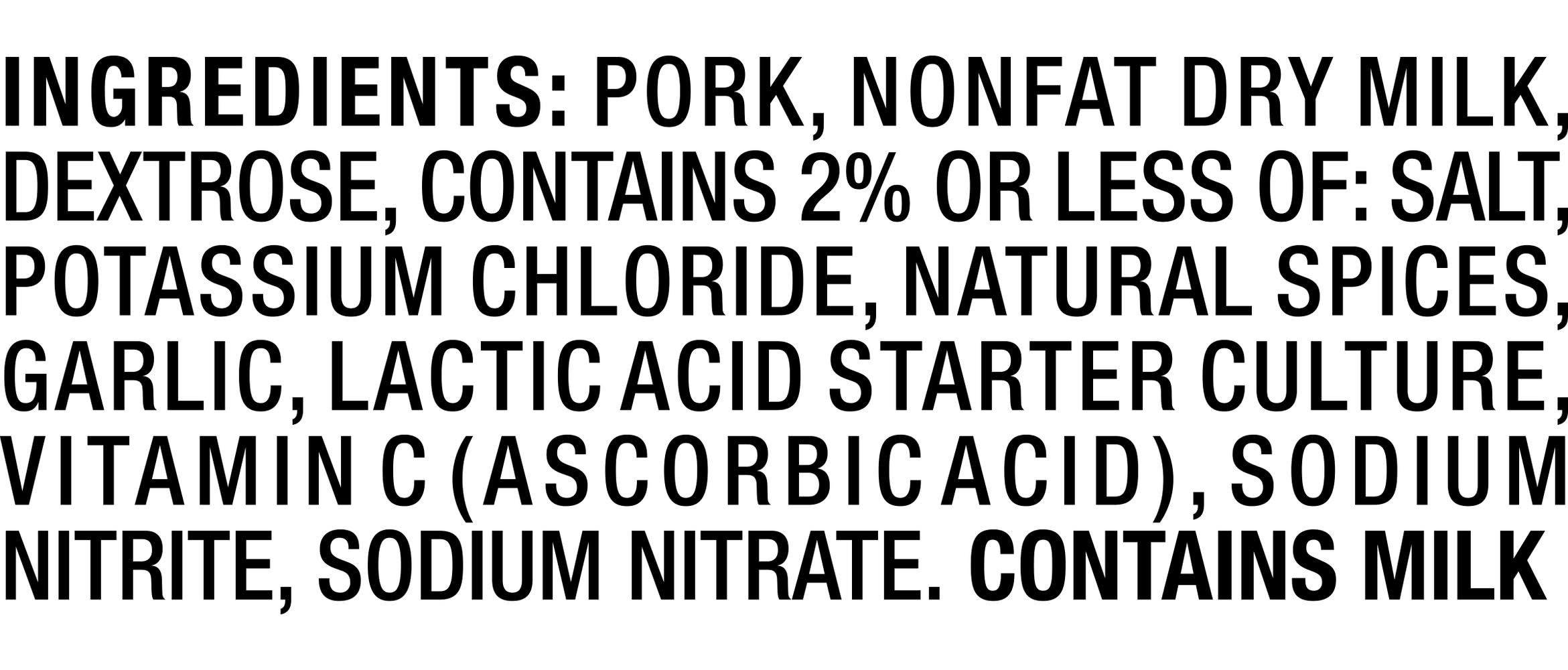 Ingredients: Pork, Nonfat Dry Milk, Dextrose, Contains 2% Or Less Of: Salt, Potassium Chloride, Natural Spices, Garlic, Lactic Acid Starter Culture, Vitamin C (Ascorbic Acid), Sodium Nitrite, Sodium Nitrate. Contains: Milk
