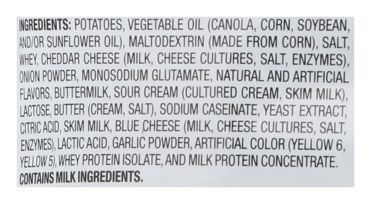 Ingredients: Potatoes, Vegetable Oil (Canola, Corn, Soybean, And/Or Sunflower Oil), Maltodextrin (Made From Corn), Salt, Whey, Cheddar Cheese (Milk, Cheese Cultures, Salt, Enzymes), Onion Powder, Monosodium Glutamate, Natural And Artificial Flavors, Buttermilk, Sour Cream (Cultured Cream, Skim Milk), Lactose, Butter (Cream, Salt), Sodium Caseinate, Yeast Extract, Citric Acid, Skim Milk, Blue Cheese (Milk, Cheese Cultures, Salt, Enzymes), Lactic Acid, Garlic Powder, Artificial Color (Yellow 6, Yellow 5), Whey Protein Isolate, And Milk Protein Concentrate. CONTAINS MILK INGREDIENTS. Contains: Milk, Corn, Soybeans, Lactose