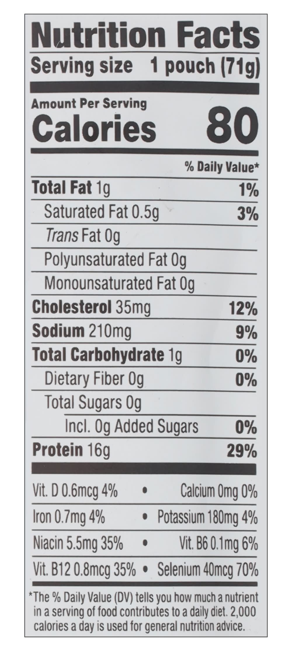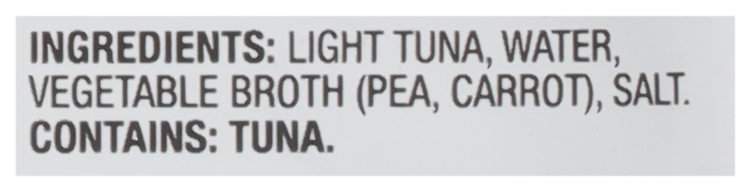 Ingredients: Light Tuna, Water, Vegetable Broth (Pea, Carrot), Salt Contains: Fish, Tuna