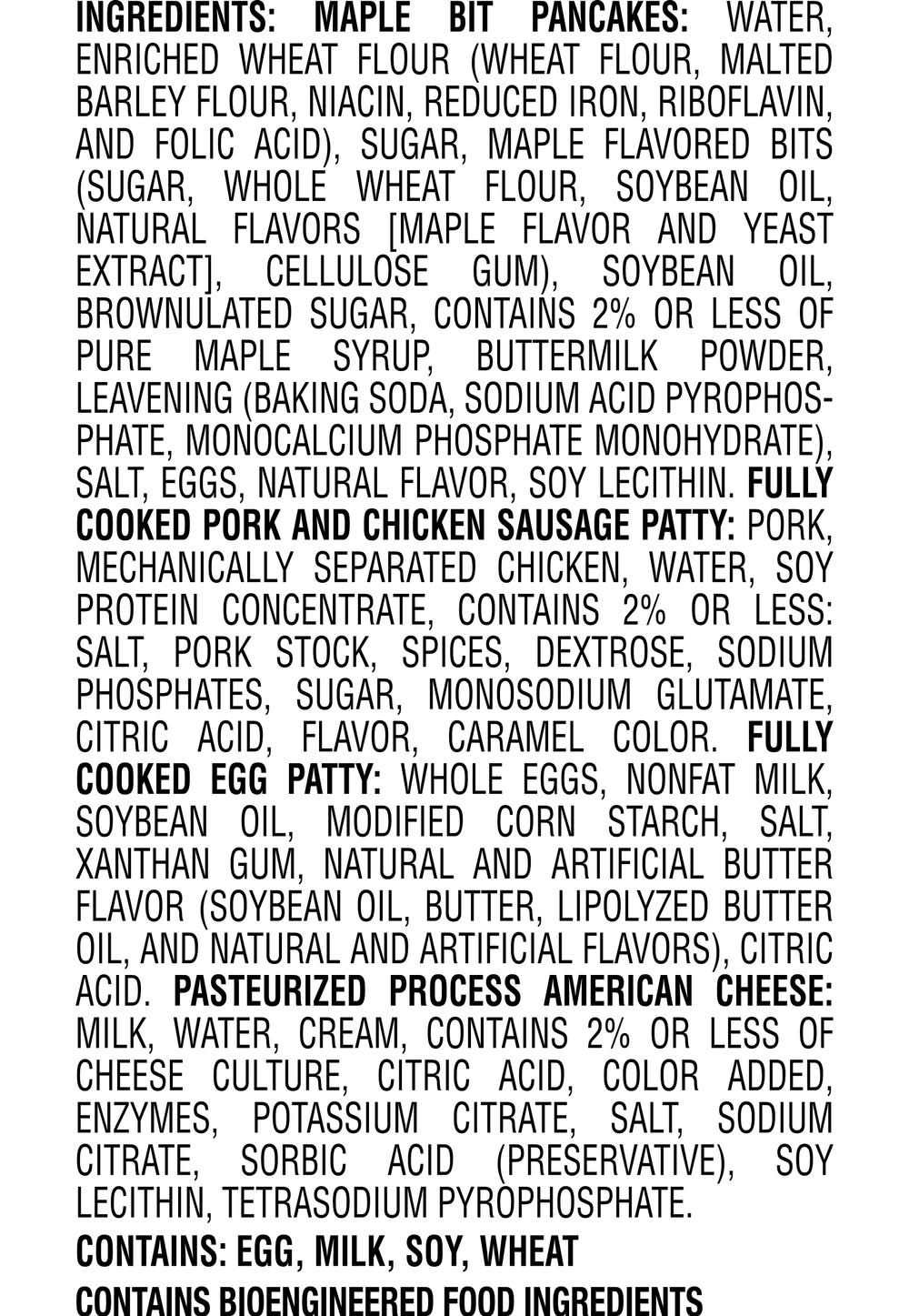 Ingredients: Maple Bit Pancakes: Water, Enriched Wheat Flour (Wheat Flour, Malted Barley Flour, Niacin, Reduced Iron, Riboflavin, And Folic Acid), Sugar, Maple Flavored Bits (Sugar, Whole Wheat Flour, Soybean Oil, Natural Flavors [Maple Flavor And Yeast Extract], Cellulose Gum), Soybean Oil, Brownulated Sugar, Contains 2% Or Less Of Pure Maple Syrup, Buttermilk Powder, Leavening (Baking Soda, Sodium Acid Pyrophosphate, Monocalcium Phosphate Monohydrate), Salt, Eggs, Natural Flavor, Soy Lecithin. Fully Cooked Pork And Chicken Sausage Patty: Pork, Mechanically Separated Chicken, Water, Soy Protein Concentrate, Contains 2% Or Less: Salt, Pork Stock, Spices, Dextrose, Sodium Phosphates, Sugar, Monosodium Glutamate, Citric Acid, Flavor, Caramel Color. Fully Cooked Egg Patty: Whole Eggs, Nonfat Milk, Soybean Oil, Modified Corn Starch, Salt, Xanthan Gum, Natural And Artificial Butter Flavor (Soybean Oil, Butter, Lipolyzed Butter Oil, And Natural And Artificial Flavors), Citric Acid. Pasteurized Process American Cheese: Milk, Water, Cream, Contains 2% Or Less Of Cheese Culture, Citric Acid, Color Added, Enzymes, Potassium Citrate, Salt, Sodium Citrate, Sorbic Acid (Preservative), Soy Lecithin, Tetrasodium Pyrophosphate. Contains: Eggs, Milk, Soybeans, Wheat, Barley, Corn