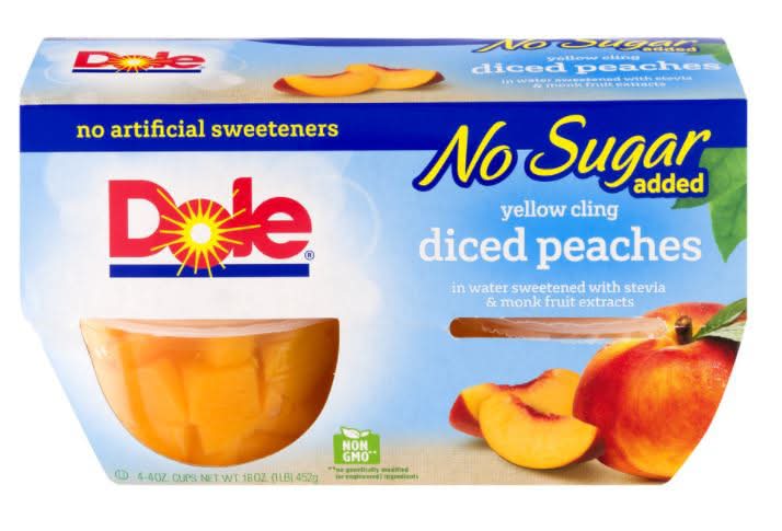 Diced Yellow Cling Peaches are preserved in water with stevia extract as a sweetening agent. Each serving contains 30 calories, zero grams of saturated fat, no sodium, 6 grams of total sugars, and 27 milligrams of vitamin C, which is 30% of the daily value. These peaches are an excellent source of vitamin C, a vital antioxidant that supports a healthy immune system. They are non-GMO and contain no added sugar or artificial sweeteners. The product is packed in Thailand, and the origin of the peaches can be verified on the bottom of the sleeve. Customers are encouraged to recycle the packaging after use. • Pack size: 4 • Dole Packaged Foods, LLC, Westlake Village,CA,91361 • Packaging: Reusable