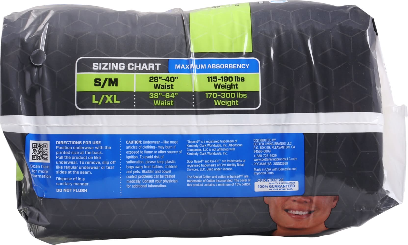 28 inches - 64 inches waist. With odor guard. Printed waistband. Compare to depend (Depend is a registered trademark of Kimberly-Clark Worldwide, Inc. Albertsons Companies, LLC is not affiliated with Kimberly-Clark Worldwide, Inc). Dri-Fit. Contoured between the legs for a better fit. Sizing Chart: Maximum absorbency. S/M 28 inches - 40 inches waist; 115-190 lbs weight. The dri-fit system: A powerful combo that keeps you dry and comfortable. Comfort: Cotton enhanced surface helps keep the skin healthy by reducing friction. Protection: Super absorbent core quickly locks up moisture and odor. Skin health: Cotton enhanced surface wicks away moisture to help your skin stay dry. Fit: Contoured between the legs for a better fit and less bunching. How it works: A lot of science goes into feeling this natural. Quality guaranteed. Our Promise: 100% guaranteed quality & satisfaction or your money back. www.betterlivingbrandsLLC.com. madewithdrifit.com. Scan for more information. Visit madewithdrifit.com to see the Dri-Fit difference for yourself! The cover of this product contains a minimum of 15% cotton. Made in USA with domestic and imported parts. Better Living Brands Llc, PO Box 99,CA,Pleasanton,94566-0009