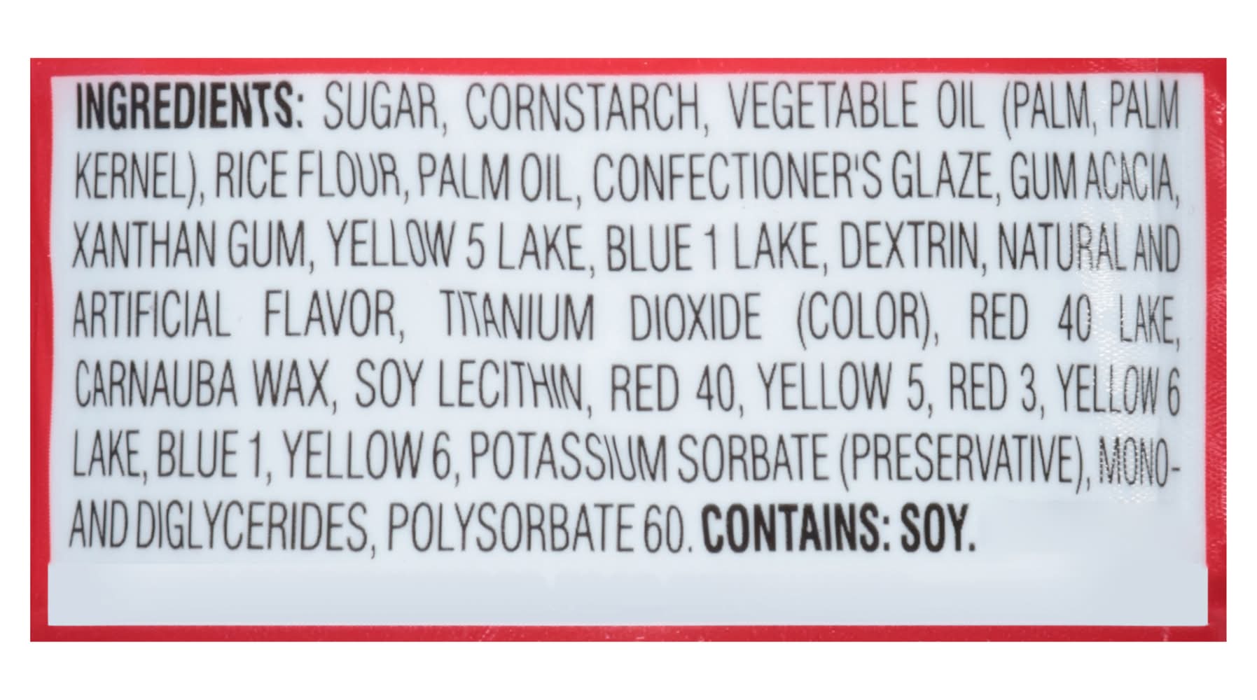 Ingredients: Sugar, Cornstarch, Vegetable Oil (Palm, Palm Kernel), Rice Flour, Palm Oil, Confectioner's Glaze, Gum Acacia, Xanthan Gum, Yellow 5 Lake, Blue 1 Lake, Dextrin, Natural and Artificial Flavor, Titanium Dioxide (Color), Red 40 Lake, Carnauba Wax, Soy Lecithin, Red 40, Yellow 5, Red 3, Yellow 6 Lake, Blue 1, Yellow 6, Potassium Sorbate (Preservative), Mono and Diglycerides, Polysorbate 60 Contains: Corn, Soybeans