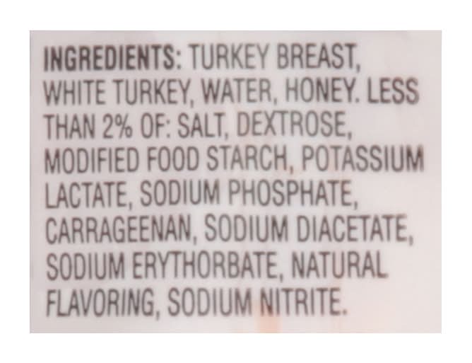 Ingredients: Turkey Breast, White Turkey, Water, Honey, Less than 2% of: Salt Dextrose, Modified Food Starch, Potassium Lactate, Sodium Phosphate, Carrageenan, Sodium Diacetate, Sodium Erythorbate, Natural Flavoring, Sodium Nitrite.