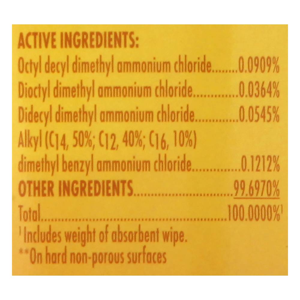 Ingredients: Active Ingredients: Octyl Decyl Dimethyl Ammonium Chloride (0.0909%), Dioctyl Dimethyl Ammonium Chloride (0.0364%), Didecyl Dimethyl Ammonium Chloride (0.0545%), Alkyl (C14, 50%; C12, 40% C16, 10%), Dimethyl Benzyl Ammonium Chloride (0.1212%). Other Ingredients (99.6970%). Total (100.0000% [Includes Weight of Absorbent Wipe]).