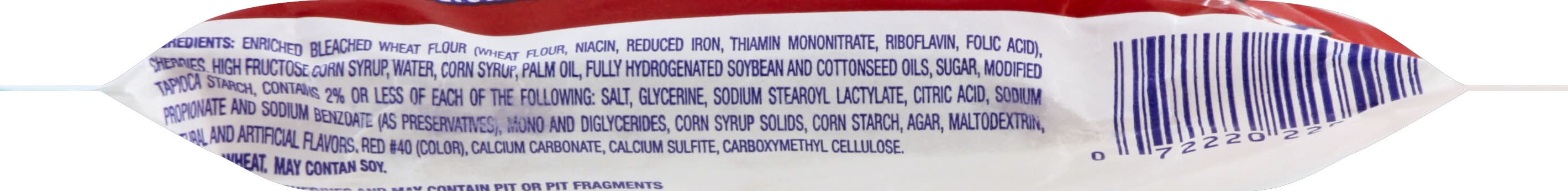 Ingredients: Enriched Bleached Wheat Flour (Wheat Flour, Niacin, Reduced Iron, Thiamin Mononitrate, Riboflavin, Folic Acid), Cherries, High Fructose Corn Syrup, Water, Corn Syrup, Palm Oil, Fully Hydrogenated Soybean and Cottonseed Oils, Sugar, Modified Tapioca Starch, Contains 2% or Less of Each of the Following: Salt, Glycerine, Sodium Stearoyl Lactylate, Citric Acid, Sodium Propionate and Sodium Benzoate (as Preservatives, Mono and Diglycerides, Corn Syrup Solids, Corn Starch, Agar, Maltodextrin, Natural and Artificial Flavors, Red 40 (Color), Calcium Carbonate, Calcium Sulfite, Carboxymethyl Cellulose Contains: Soybeans, Wheat