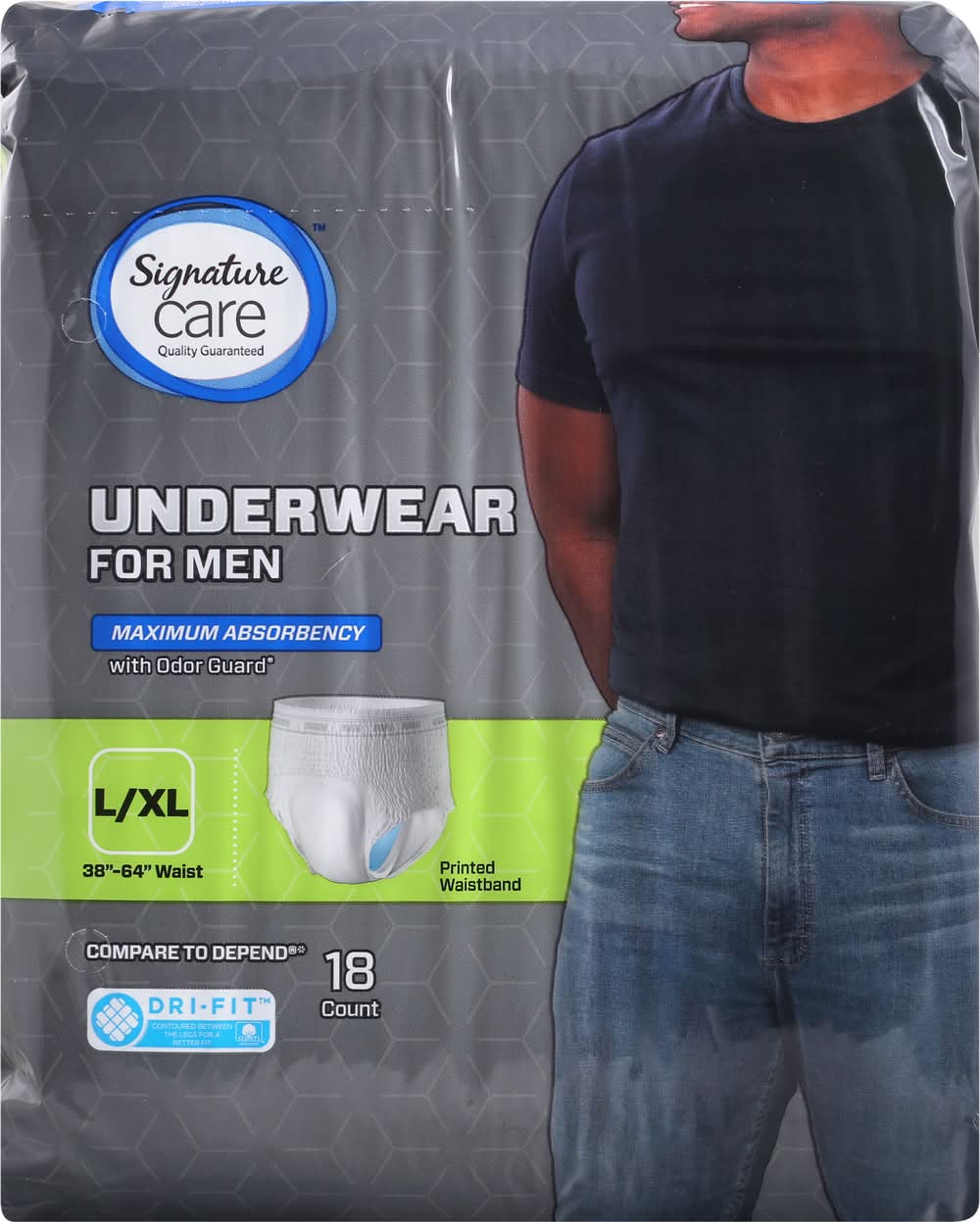 38 inch - 64 inch waist. With odor guard. Printed waistband. Compare to depend (Depend is a registered trademark of Kimberly-Clark Worldwide, Inc. Albertsons Companies, LLC is not affiliated with Kimberly-Clark Worldwide, Inc). Dri-Fit. Contoured between the legs for a better fit. Sizing Chart: Maximum absorbency. L/XL 38 inches - 64 inches waist; 170-300 lbs weight. The cover of this product contains a minimum of 15% cotton. The Dri-Fit System: A powerful combo that keeps you dry and comfortable. Comfort: Cotton enhanced surface helps keep the skin healthy by reducing friction. Protection: Super absorbent core quickly locks up moisture and odor. Skin health: Cotton enhanced surface wicks away moisture to help your skin stay dry. Fit: Contoured between the legs for a better fit and less bunching. How it works: A lot of science goes into feeling this natural. Quality guaranteed. Our Promise: 100% guaranteed quality & satisfaction or your money back. www.betterlivingbrandsLLC.com. madewithdrifit.com. Scan for more information. Visit madewithdrifit.com to see the Dri-Fit difference for yourself! Made in USA with domestic and imported parts. Better Living Brands LLC, Pleasanton,CA