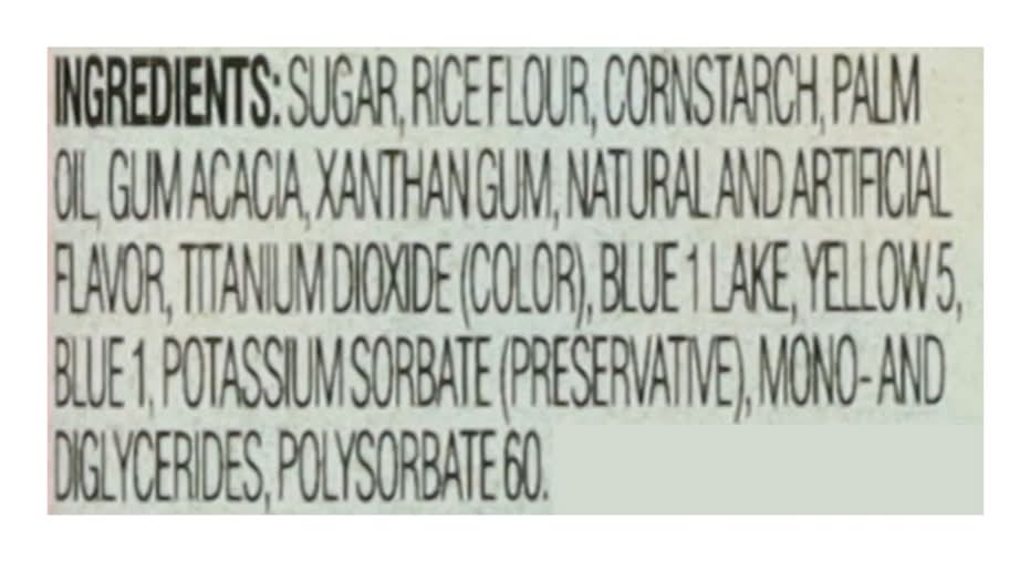 Ingredients: Sugar, Rice Flour, Cornstarch, Palm Oil, Gum Acacia, Xanthan Gum, Natural and Artificial Flavor, Titanium Dioxide (Color), Blue 1 Lake, Yellow 5, Blue 1, Potassium Sorbate (Preservative), Mono-and Diglycerides, Polysorbate 60 Contains: Corn