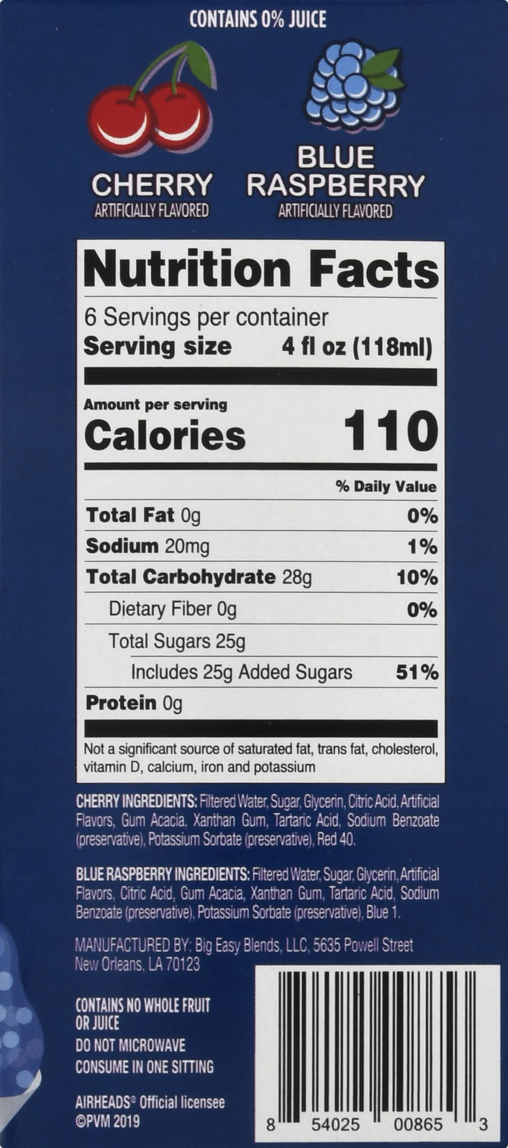 Ingredients: Cherry Ingredients: Filtered Water, Sugar, Glycerin, Citric Acid, Artificial Flavors, Gum Acacia, Xanthan Gum, Tartaric Acid, Sodium Benzoate (Preservative), Potassium Sorbate (Preservative), Red 40. Blue Raspberry Ingredients: Filtered Water, Sugar, Glycerin, Artificial Flavors, Citric Acid, Gum Acacia, Xanthan Gum, Tartaric Acid, Sodium Benzoate (Preservative), Potassium Sorbate (Preservative), Blue 1