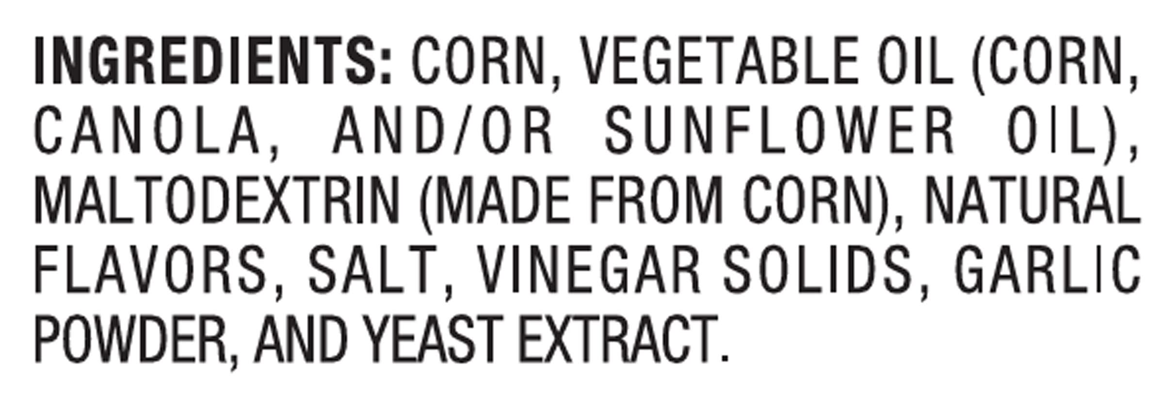 Ingredients: Corn, Vegetable Oil (Corn, Canola, and/or Sunflower Oil), Maltodextrin (Made from Corn), Natural Flavors, Salt, Vinegar Solids, Garlic Powder, and Yeast Extract Contains: Corn