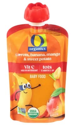 O Organics Carrots Banana Mango Sweet Potato Pouch is a baby food that includes a blend of carrots, banana, mango, and sweet potato. It is formulated to be suitable for tots.