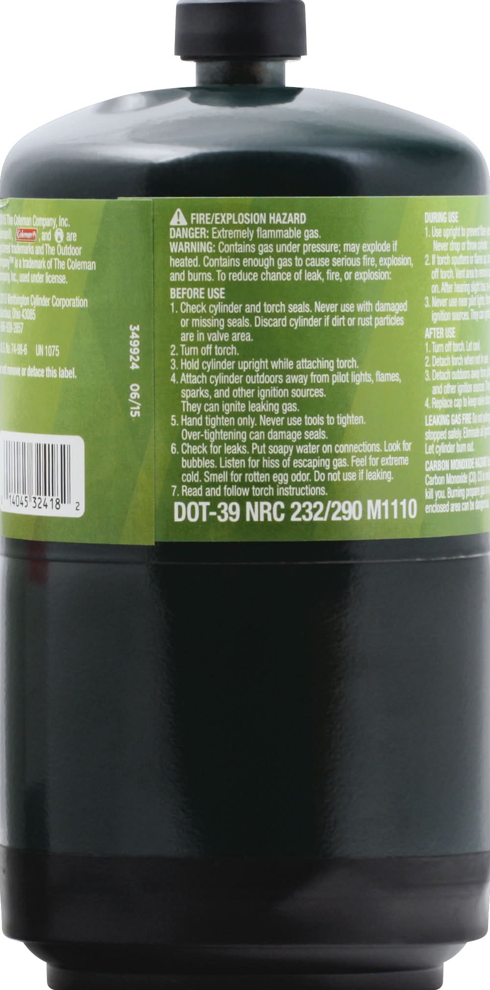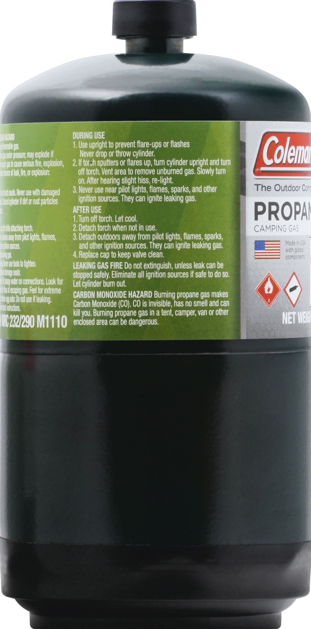Directions: use only with appliances designed for propane gas. read and follow important safety warnings on side label. handling & storage: 1. keep out of reach of children. 2. keep away from heat, sparks, or flame. no smoking. protect from sunlight. store in well-ventilated place. never store at temperatures above 120 degrees f (49 degrees c). 3. never store in living spaces. 4. never refill this cylinder. refilling may cause explosion. federal law forbids transportation if refilled - penalty up to $500,000 fine and 5 years imprisonment (49 u.s.c. 5124). 5. never put in luggage or take on trains or aircraft. 6. to discard, contact local refuse hauler or recycling center. never put in fire or incinerator. do not puncture. do not remove or deface this label.